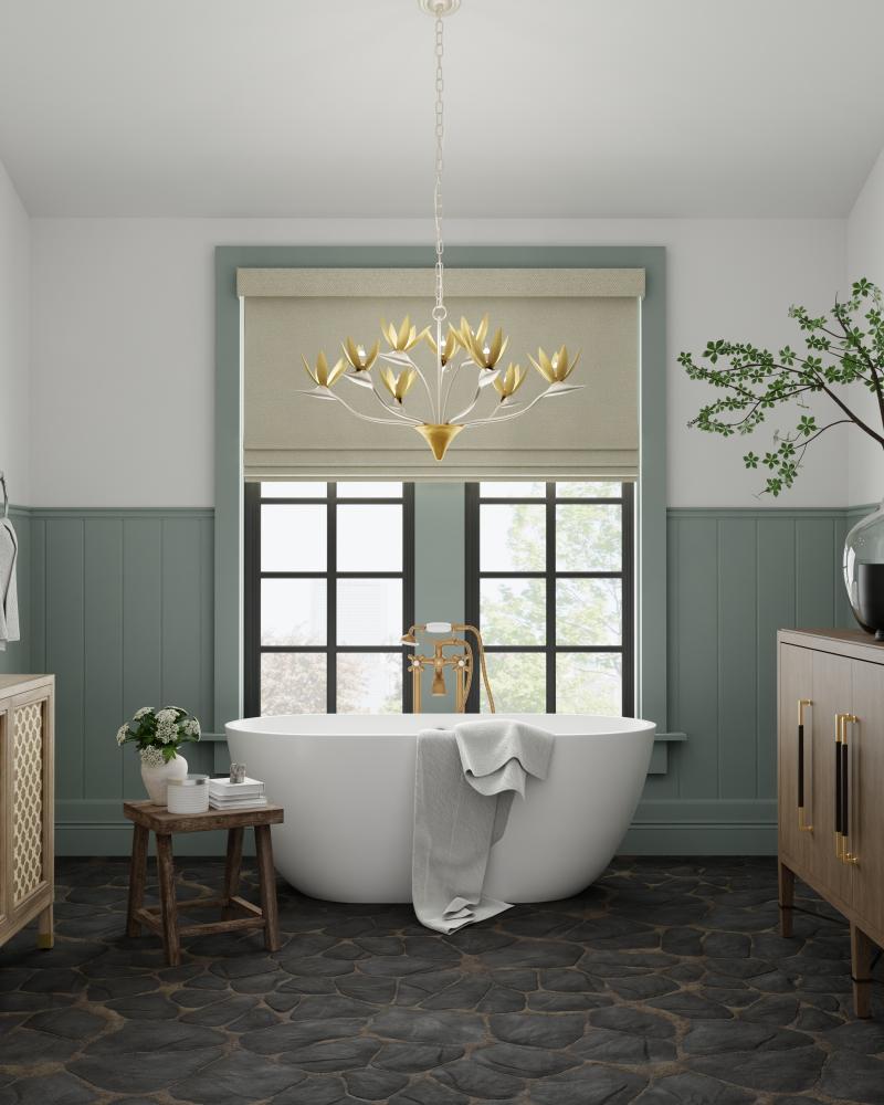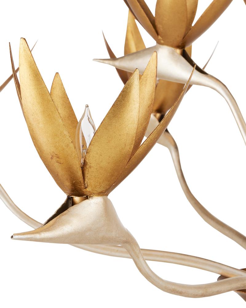Made of steel, the Paradiso Chandelier has a lyrical shape inspired by the Strelitzia reginae, more commonly known as the Bird of Paradise plant. The limbs that arc up and away from a central cone are in a contemporary silver leaf finish, while the cone and blossoms that flow around the light bulbs are in a contemporary gold leaf finish. This silver and gold chandelier is an example of how nature-inspired design elements are driving the biophilic movement. Adjustable from 28.25" to 95.75" with use of included chain/rod kit/cable. If your space calls for a longer drop, additional chain/rods/cable is available for purchase.