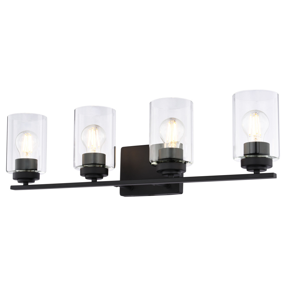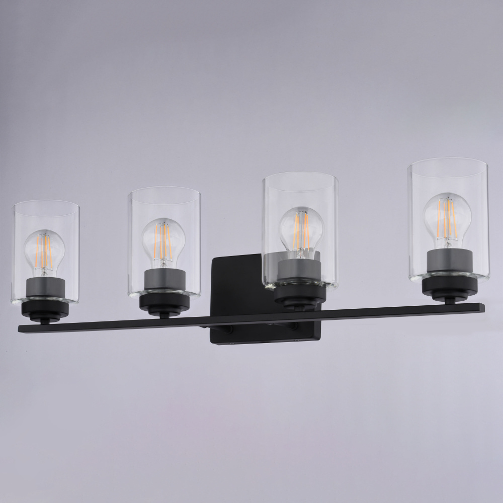 Bring a touch of minimalist sophistication to your bathroom with the Park Ridge 4-light vanity wall fixture. Its matte black finish and clear cylindrical glass shade create a striking focal point, casting a crisp, radiant glow perfect for any bathroom setting. Whether your style is contemporary, transitional, or even modern farmhouse, its clean lines and timeless design will complement your decor. The streamlined, straight bar design offers a contemporary edge, seamlessly blending transitional and modern aesthetics, while ensuring a quick and effortless upgrade to your space. Experience the perfect balance of style and function, transforming your bathroom into a personal sanctuary.