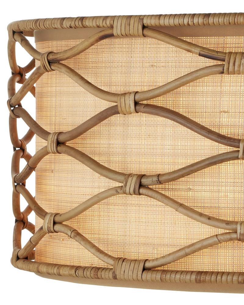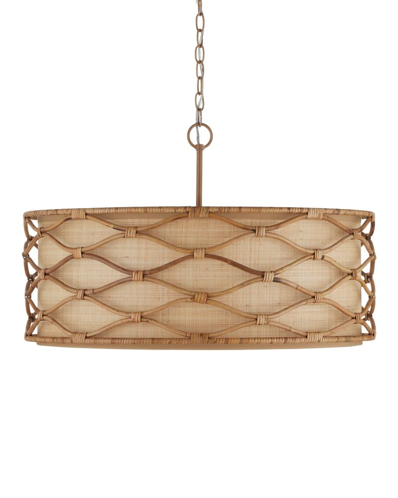 The Partita Pendant is a natural material story through and through. The illumination is softened from the sides and the bottom by grasscloth that shows off its subtle texture when the light filters through it. Surrounding the shade is a rattan pattern that flows elegantly without seeming to begin or end. The process to create this ornamentation is painstaking, as the rattan is steamed and bent by hand, then bound together with thin bands of the same material. to be consistent with the overall color of the other elements, the wrought iron frame and hardware on the pendant are finished in a saddle tan. Adjustable from 24.5" to 92.5" with use of included chain/rod kit/cable. If your space calls for a longer drop, additional chain/rods/cable is available for purchase.