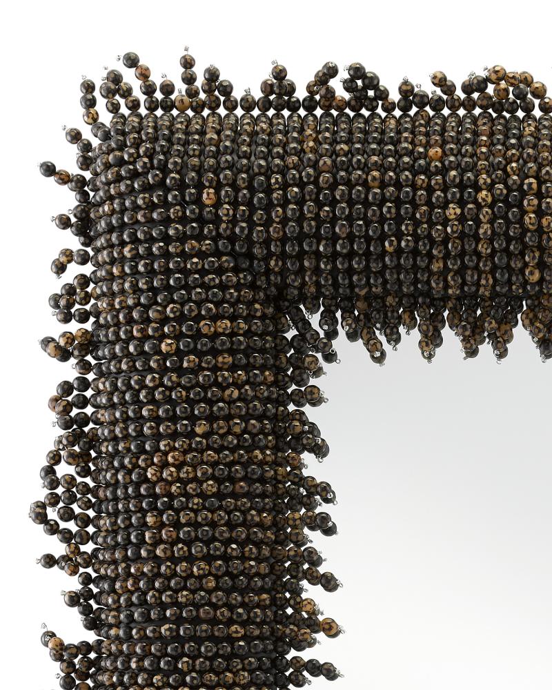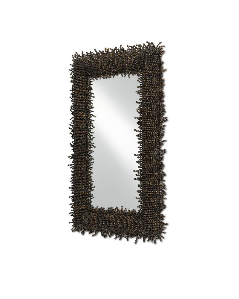 Textural playfulness results when strung Buri beads are fastened to the frame of our Pasay Rectangular Mirror, particularly when the ends of strands extend beyond the edge of the dark brown decorative mirror.