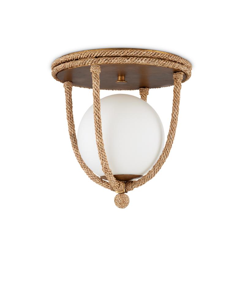 The Passageway Flush Mount is a cleverly designed rope-wrapped ceiling light. The warmth of the rope combined with the dorado gold finish contrasts the frosted glass globe to bring this design heft. One of the arms that hold the globe in place is removable to make changing the bulbs on this brown ceiling light easy.