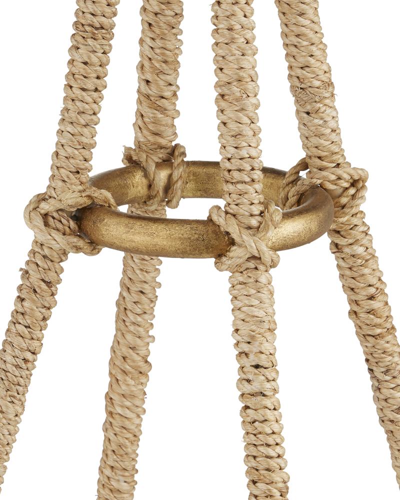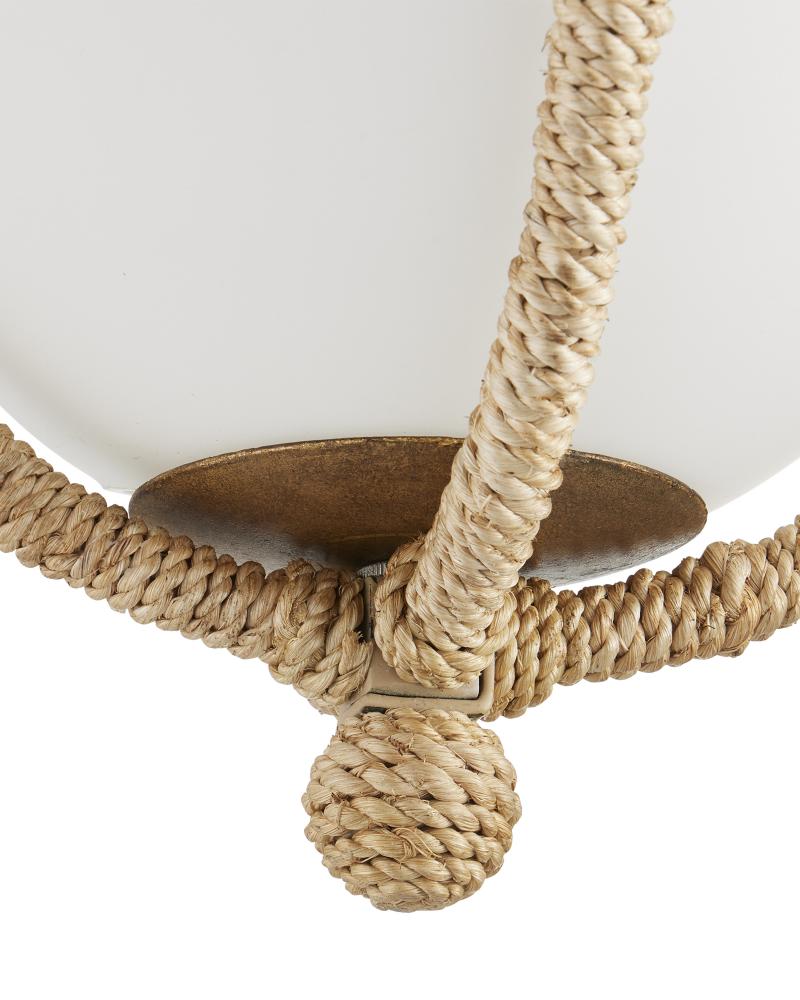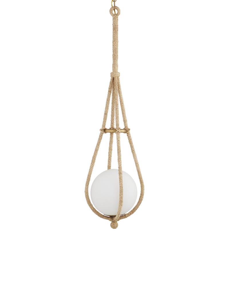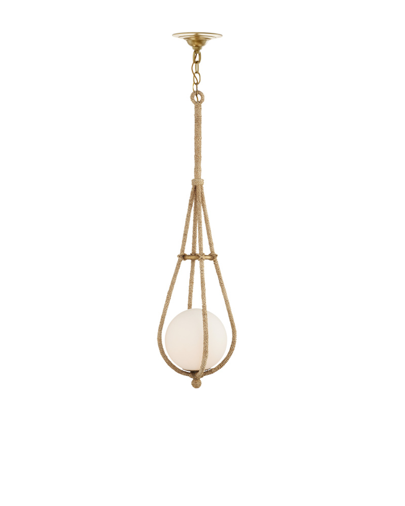 The Passageway Pendant is a cleverly designed ceiling light that combines the warmth of rope wrapping with a dorado gold finish, contrasting beautifully with the frosted glass globe to give the design a sense of heft. Four arms hold the globe in place, one of which is removable to make changing the bulbs on this tan pendant easy. This fixture is perfectly suited to nautical environments, given its seaworthy shape. Adjustable from 43.5" to 111.5" with use of included chain/rod kit/cable. If your space calls for a longer drop, additional chain/rods/cable is available for purchase.