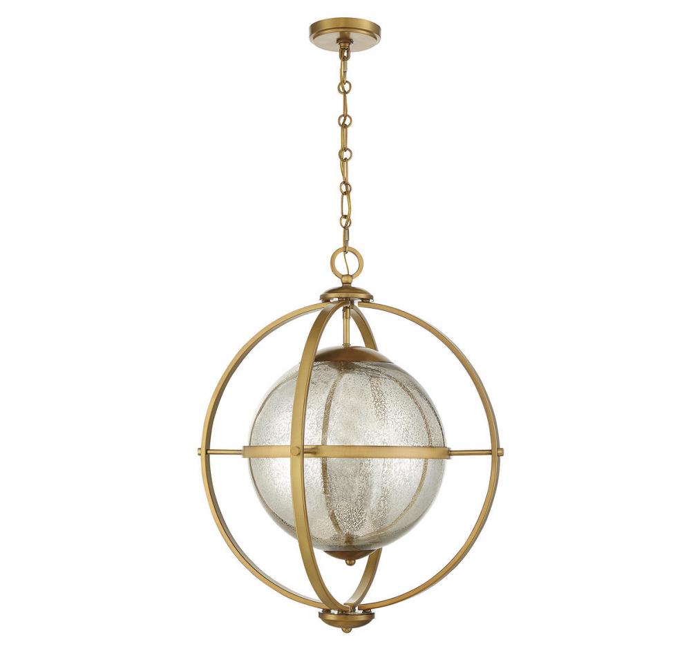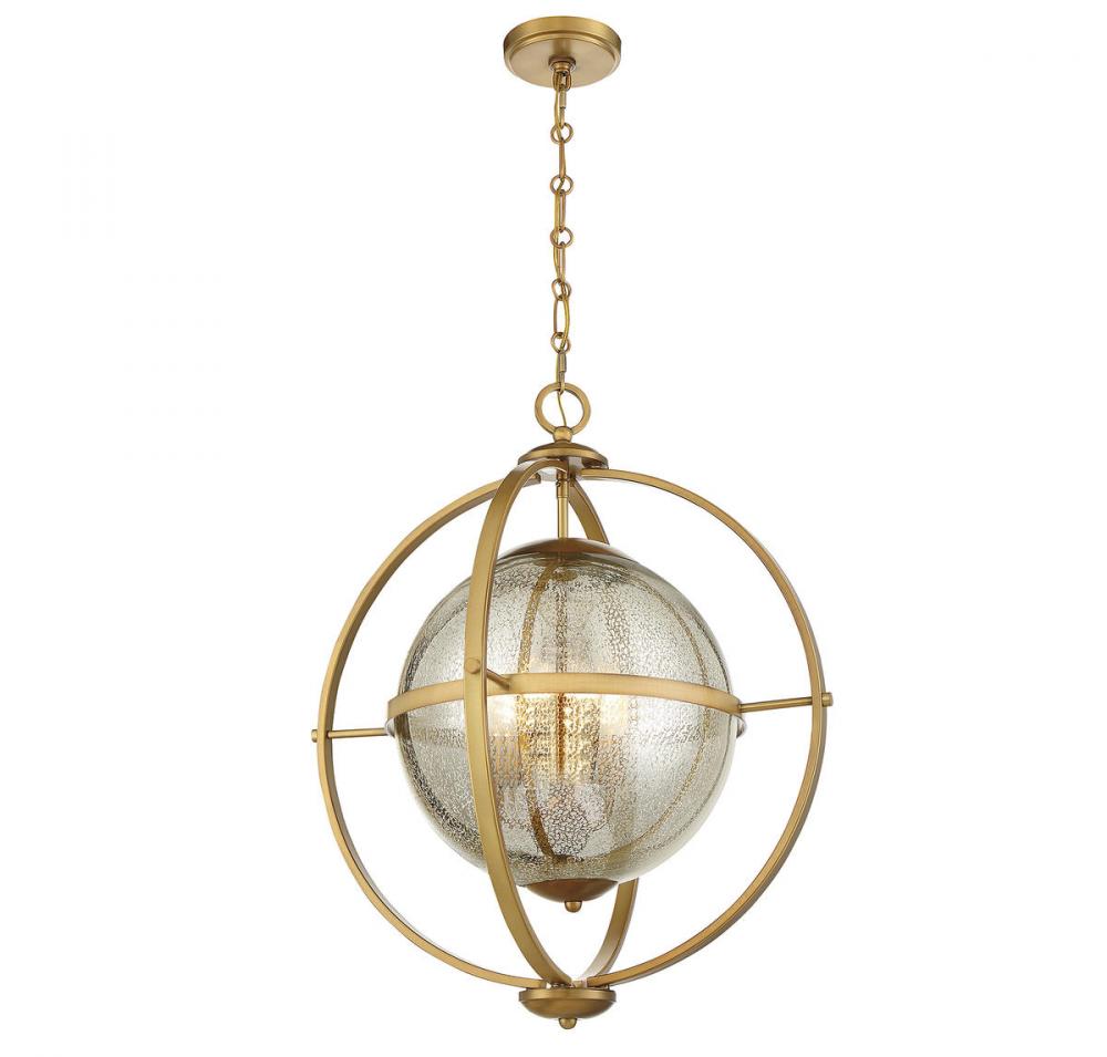 It is often said that lighting is the jewelry of the home. The Savoy House Pearl 3-light pendant, then, is that saying made into a reality! Pearl features an orb of mercury glass that seems to be suspended in midair, held in place by a contemporary-style structure finished in warm brass. Pearl is 24" in height and 21" in diameter. It uses three candelabra size bulbs of up to 60 watts per bulb. Comes with 120" of chain and 144" of cord.