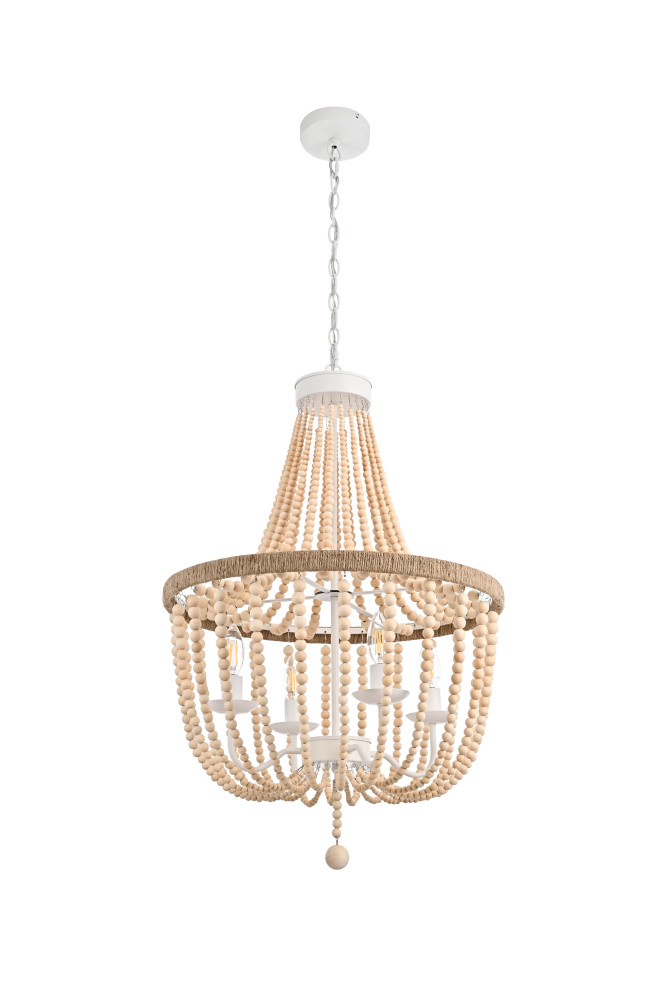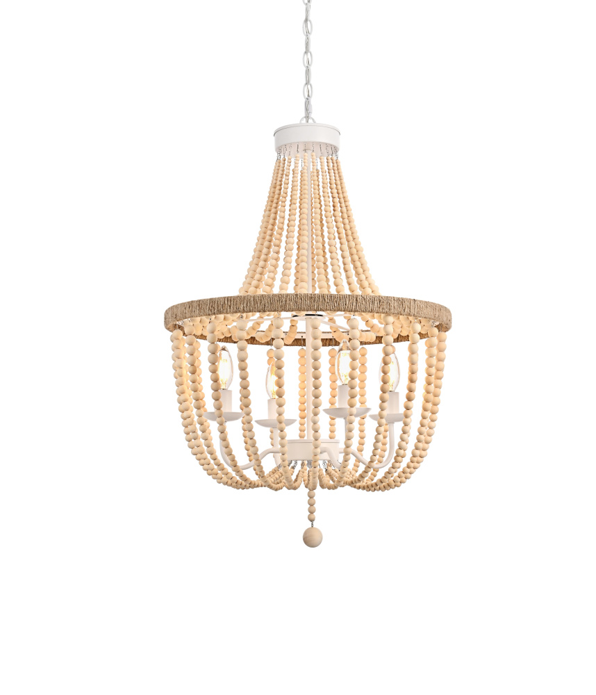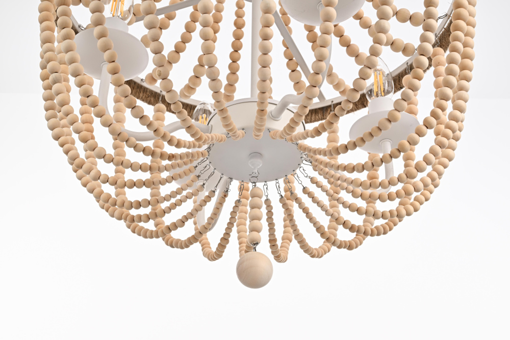 Elevate your space with this masterfully crafted pendant that artfully blends rustic charm with refined elegance. The dramatic cascading strands of wooden beads create a mesmerizing display of light and shadow, while the rope-wrapped crown adds an authentic touch of artisanal craftsmanship. Each piece showcases the natural beauty of carefully selected wooden beads, arranged in graceful loops that draw the eye upward and create a sense of gentle movement. The substantial iron framework ensures stability while maintaining an airy, elegant presence. Perfect for dining rooms, entryways, or living spaces, this versatile fixture adapts beautifully to various ceiling heights through its adjustable chain system. The three-light design provides ample illumination while creating enchanting patterns through the beaded strands. Whether styled in sophisticated antique white or warm natural beige, this pendant makes a striking statement while maintaining an organic, approachable presence. The thoughtful blend of materials and textures creates a piece that feels both timeless and fresh, making it an ideal choice for designers and homeowners seeking to create a space with both character and refinement.