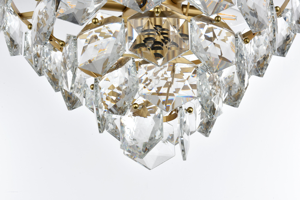 Features a stunning multi-tier arrangement of faceted crystals cascading down, creating a layered, dynamic visual effect that draws the eye and adds depth to any room.