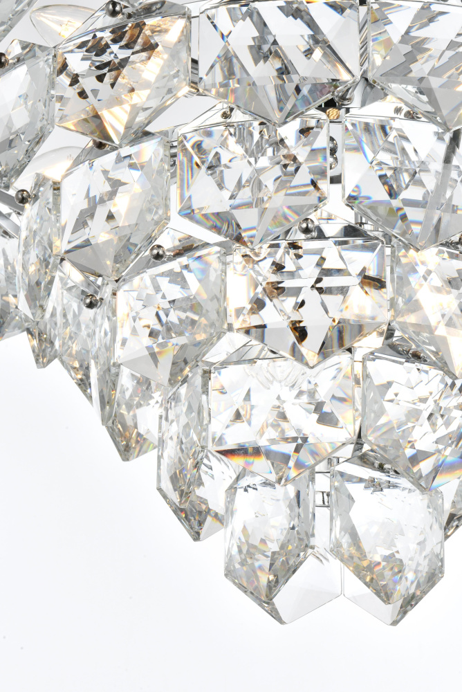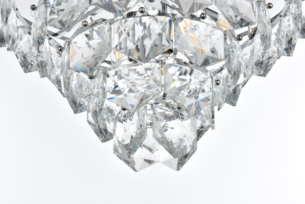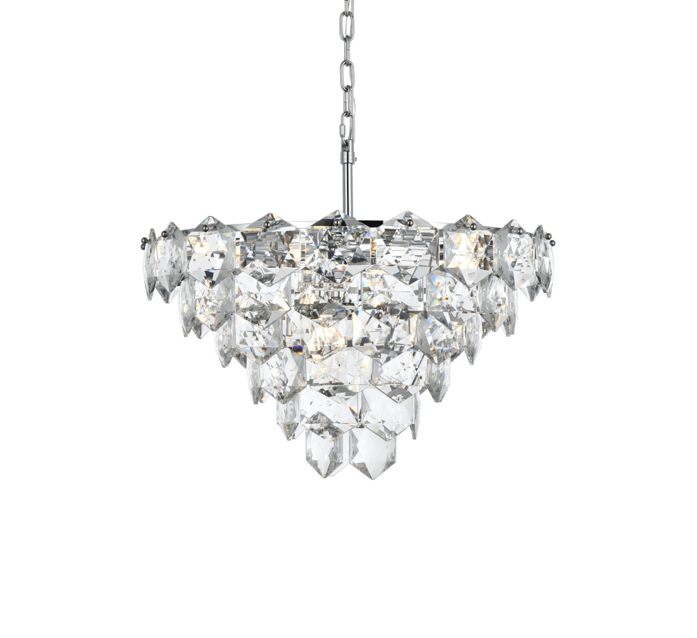 Features a stunning multi-tier arrangement of faceted crystals cascading down, creating a layered, dynamic visual effect that draws the eye and adds depth to any room.