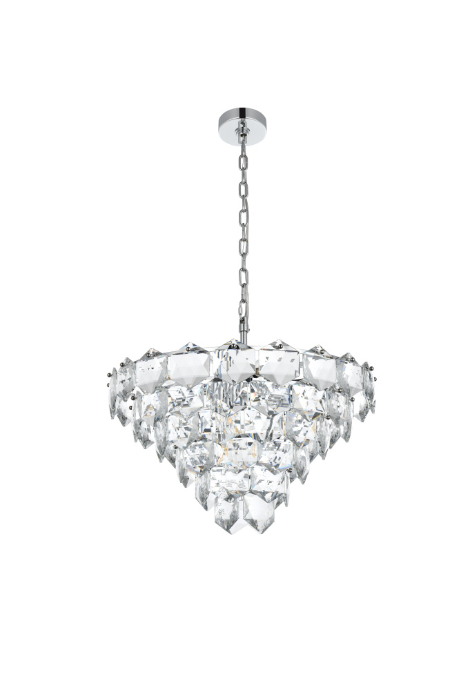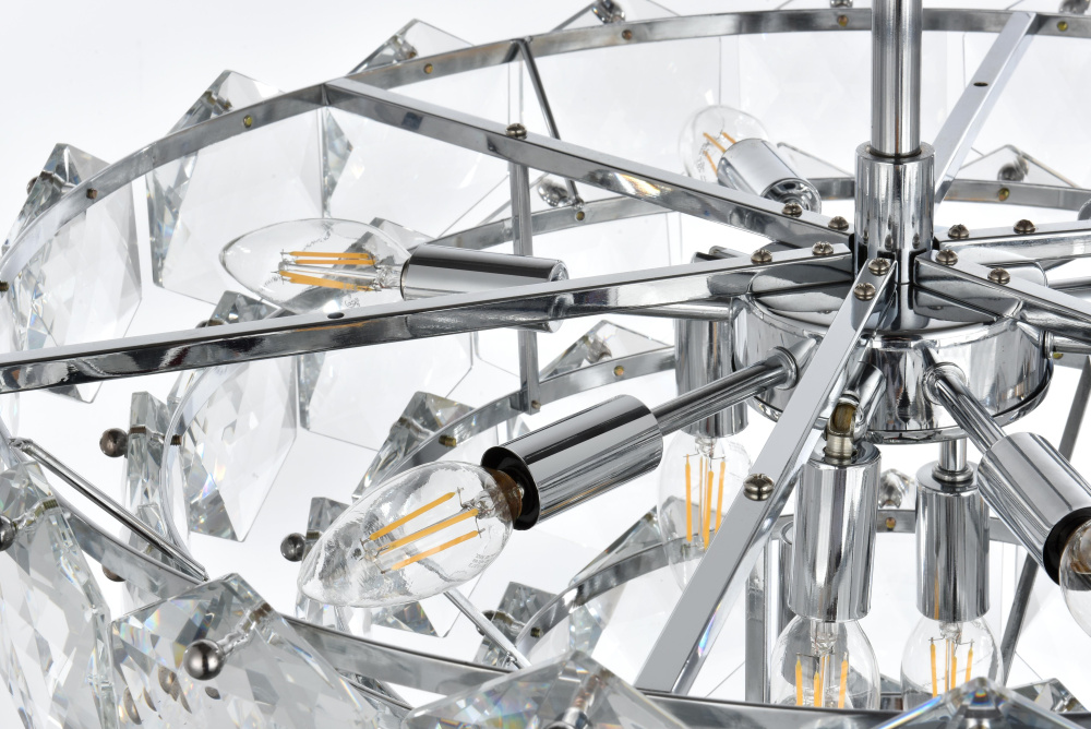 Transform your space with this cascading multi-tier pendant light that combines striking design with meticulous craftsmanship. Crafted from a sturdy iron frame and adorned with six-sided faceted crystals, this lighting piece exudes charm through its ability to diffuse light into a soft, radiant glow. With finishes available in both sleek chrome for a contemporary feel and satin gold for a warmer, refined touch, it complements a range of decor styles. The adjustable height, from 23 inches to 83 inches with the included 59-inch chain, ensures it fits seamlessly in any setting. Equipped with eleven E12 sockets and dimmable functionality, you can customize the lighting to suit your mood or occasion. Its matching canopy and chain finish complete the cohesive design, making it perfect for kitchens, dining rooms, living rooms, or offices. A statement piece that transforms your space into a work of art, this pendant is the perfect blend of style and functionality.