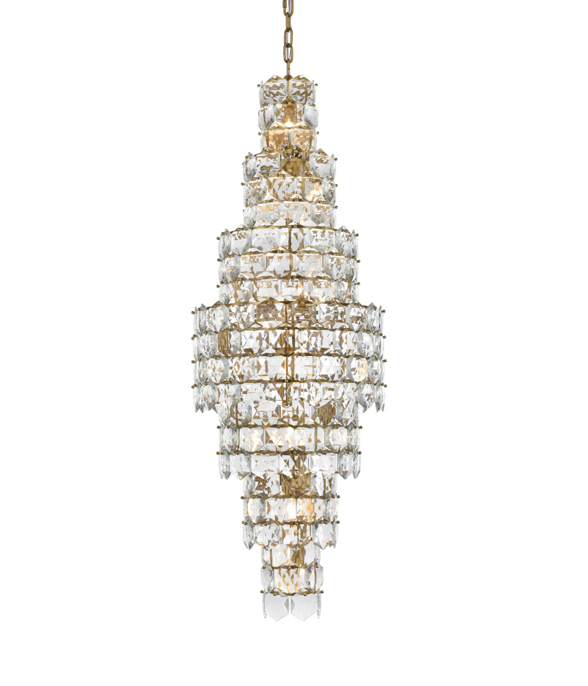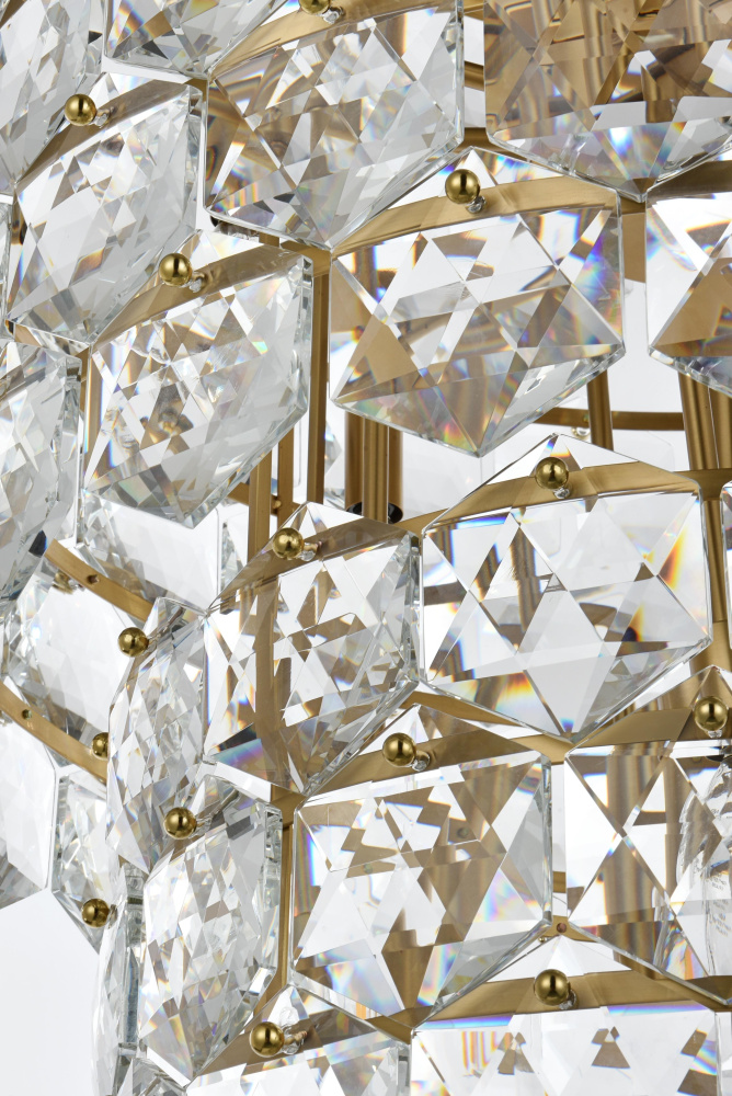Transform your space with this spectacular crystal pendant that redefines modern luxury. The masterfully engineered design features ten graduating tiers that create a dramatic tapered silhouette, reminiscent of a frozen waterfall captured in mid-descent. Each precisely cut hexagonal crystal is strategically positioned to maximize light play, creating mesmerizing displays of fractured light and shadow throughout your space. The substantial scale and architectural presence make this fixture an ideal centerpiece for grand entryways, sophisticated dining rooms, or executive offices. The thoughtful construction incorporates 26 light sources distributed throughout the tiers, ensuring both spectacular illumination and enchanting crystal animation. The robust iron framework provides a secure foundation while maintaining visual lightness, allowing the crystals to appear as if floating in space. Whether styled in reflective chrome or warm satin gold, this pendant makes an unforgettable statement while maintaining sophisticated restraint. The cascading arrangement creates a sense of movement and flow, while the geometric precision of each crystal adds contemporary edge to the classical form. This is more than a light fixture – it's an architectural feature that transforms your space through its commanding presence and spectacular light performanc