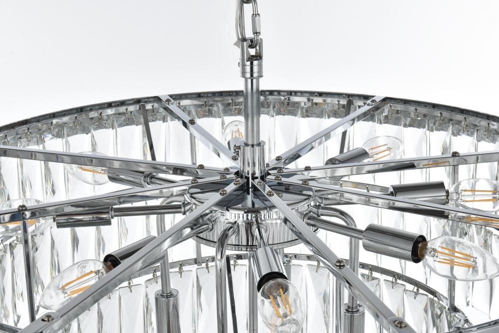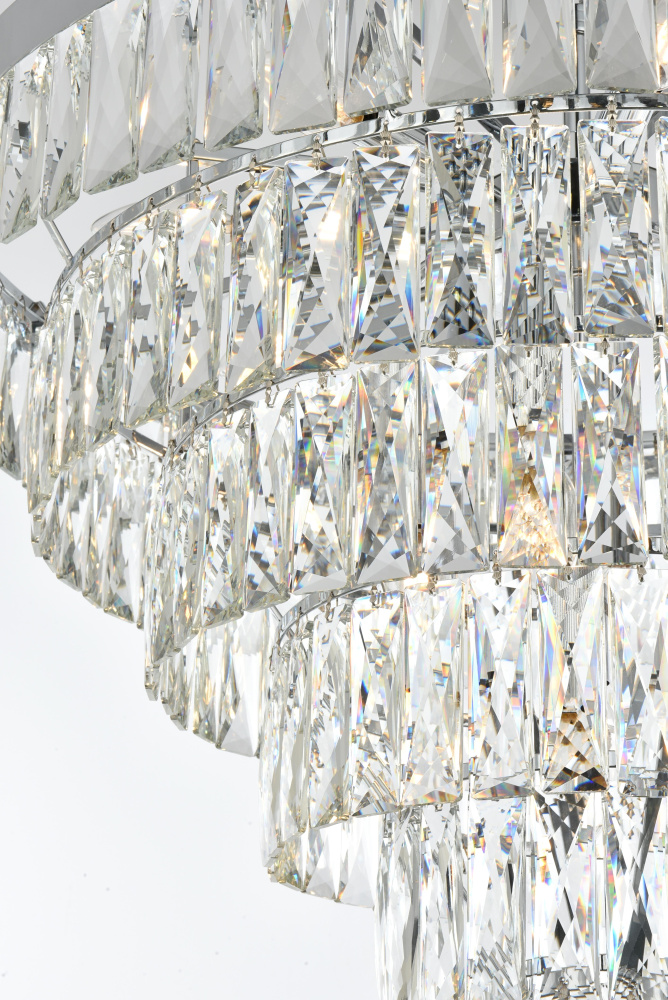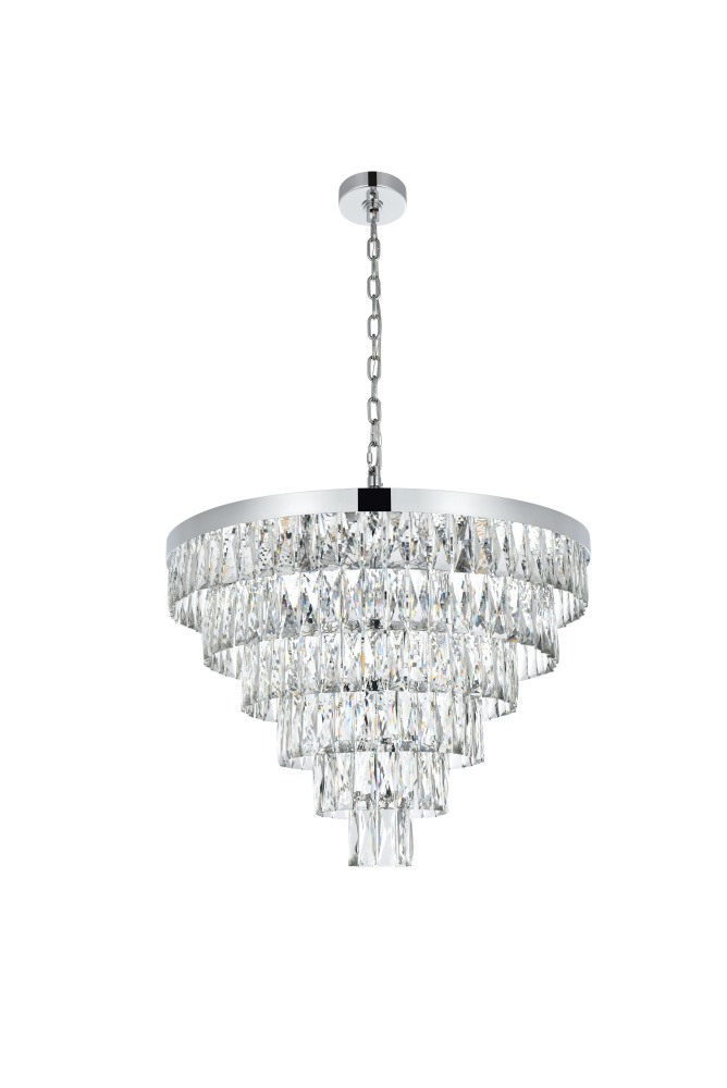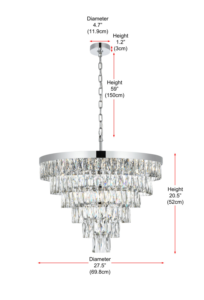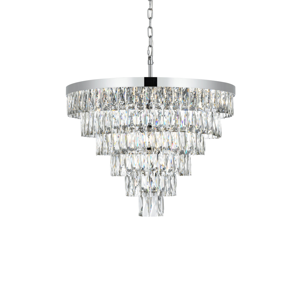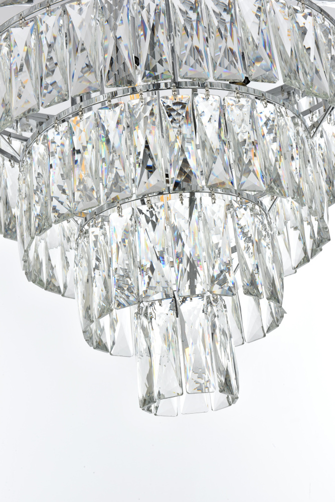 Transform your space with this extraordinary pendant that reimagines classical crystal design for contemporary interiors. The masterfully engineered silhouette features six graduating tiers that create a spectacular inverted pyramid, reminiscent of a frozen cascade captured in mid-descent. Each precisely cut rectangular crystal is strategically positioned to maximize light play, creating mesmerizing displays of fractured light throughout your space. The substantial scale makes this fixture an ideal centerpiece for grand entryways, sophisticated dining rooms, or executive offices. The thoughtful construction incorporates 13 light sources distributed throughout the tiers, ensuring both spectacular illumination and enchanting crystal animation. The robust iron framework provides a secure foundation while maintaining visual lightness, allowing the crystals to appear as if floating in space. Available in reflective chrome, sophisticated black, or warm satin gold, this pendant makes an unforgettable statement while maintaining refined restraint. The cascading arrangement creates a sense of movement and flow, while the geometric precision of each crystal adds contemporary edge to the classical form. This is more than a light fixture – it's an architectural feature that transforms your space through its commanding presence and spectacular light performanc