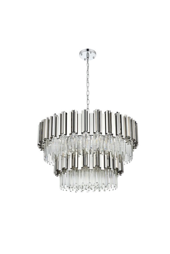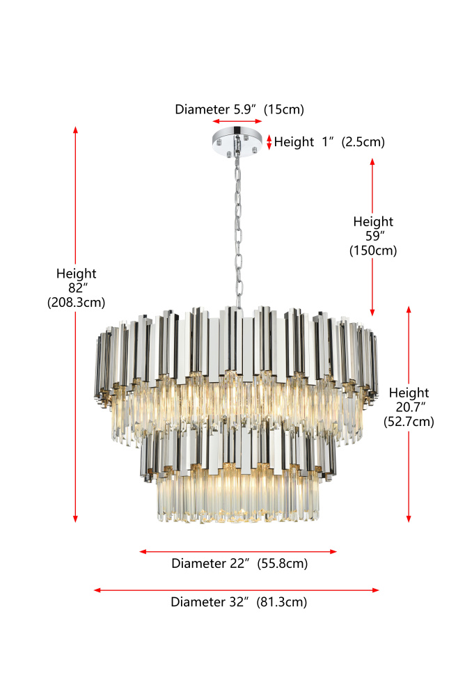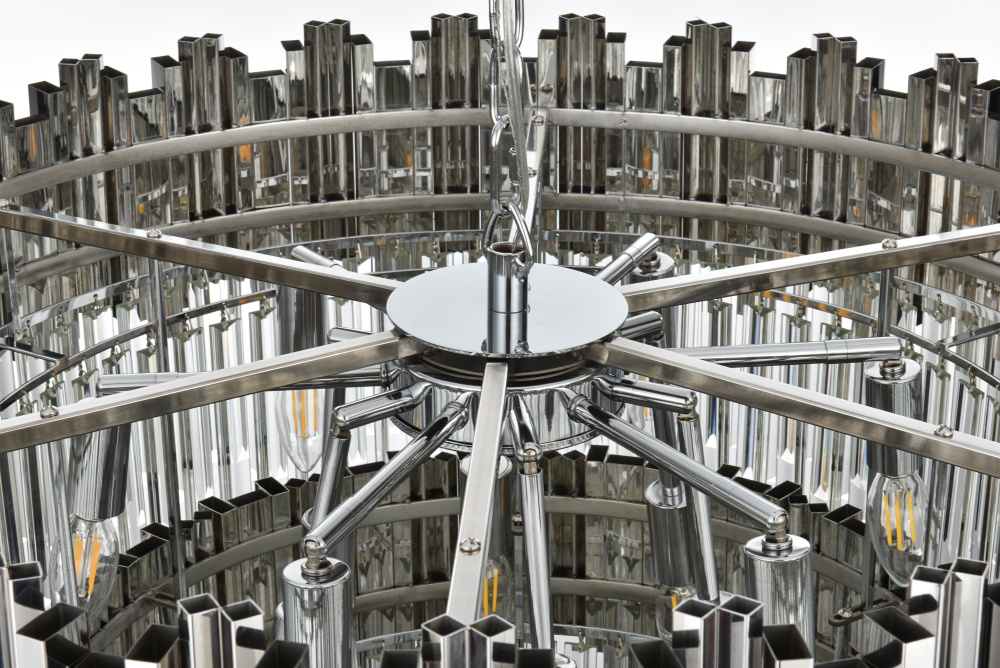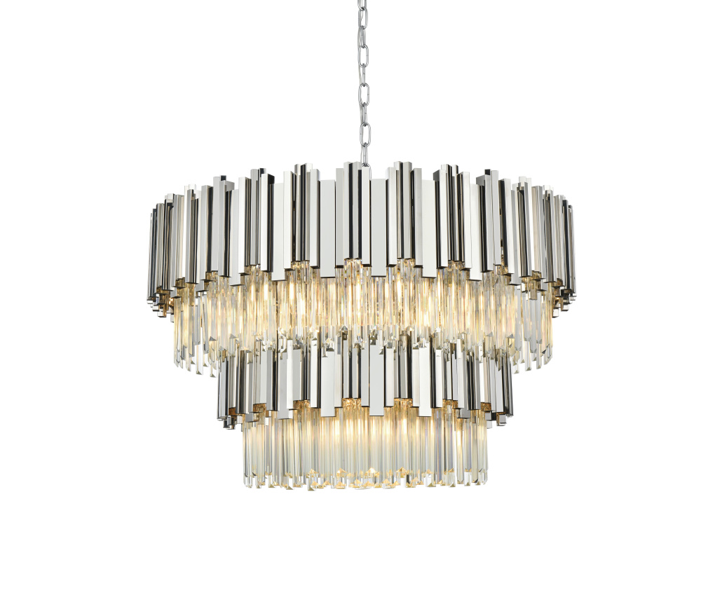 Transform your space with this stunning chandelier, a dynamic fusion of iron and staggered clear glass that exudes contemporary style and architectural artistry. The layered glass refracts light beautifully, creating a radiant display of glowing brilliance that fills the room with warmth and sophistication. The staggered arrangement of the metal and glass adds depth and dimension, making this chandelier an eye-catching centerpiece. Fully dimmable, it allows you to adjust the ambiance to suit any mood, from bright and vibrant to soft and inviting. Available in satin gold for a warm, luxurious vibe, chrome for sleek modernity, and black for bold, dramatic contrast, this fixture comes in various sizes to perfectly complement any space. Complete with a matching canopy, it’s an ideal choice for dining rooms, living rooms, or offices. Add a touch of refined geometry to your décor and bask in the brilliance of this radiant desi