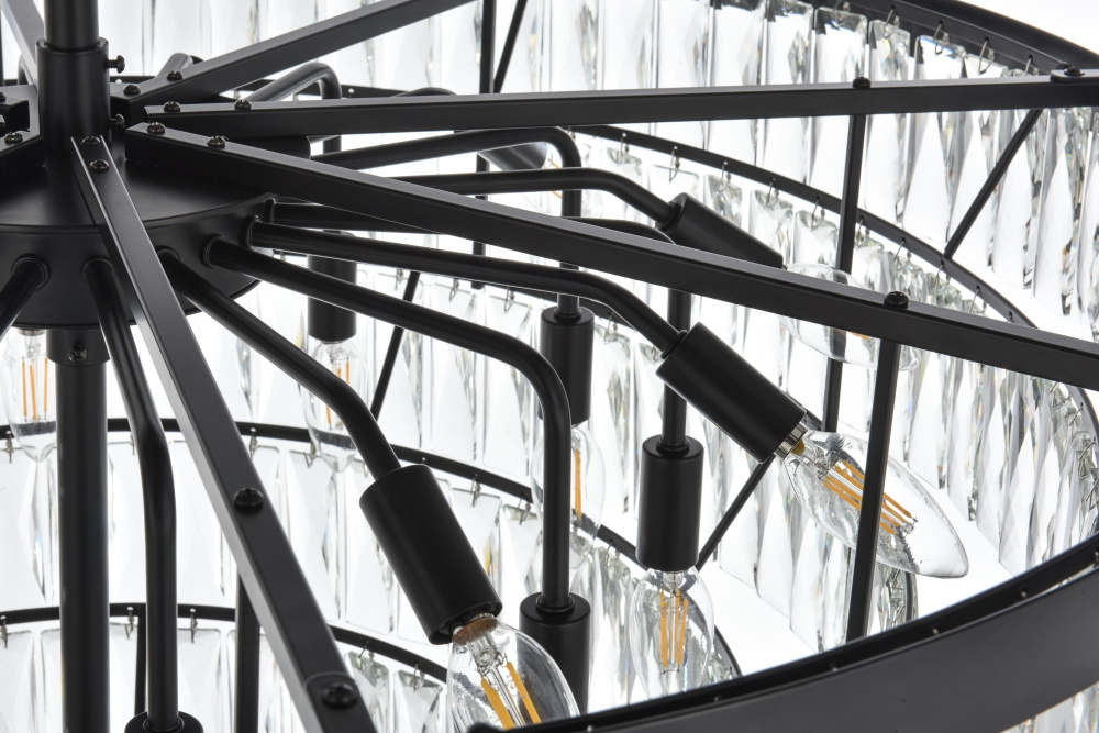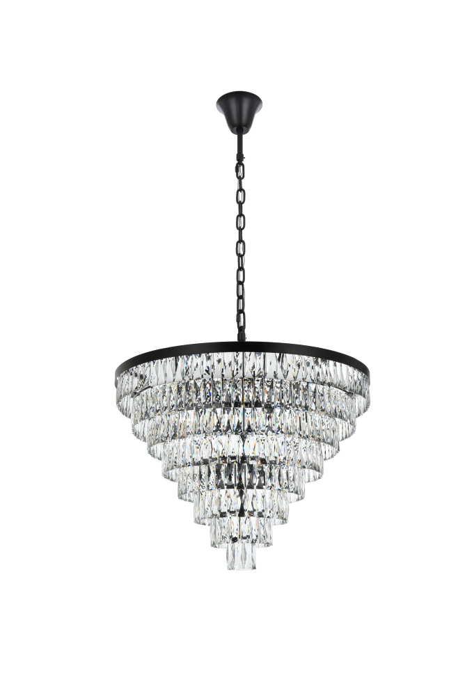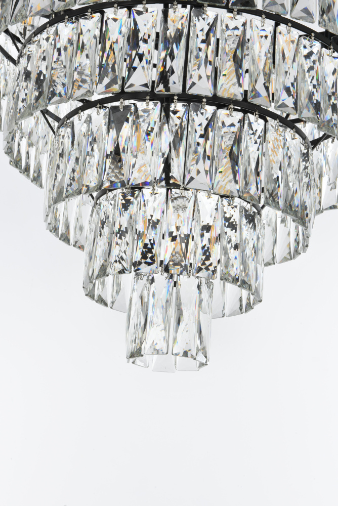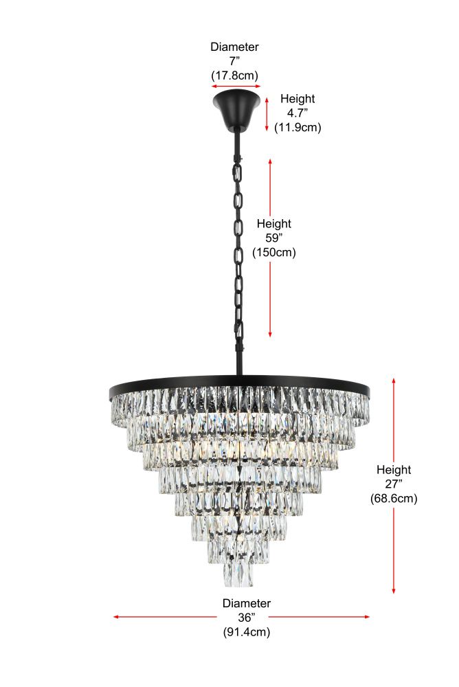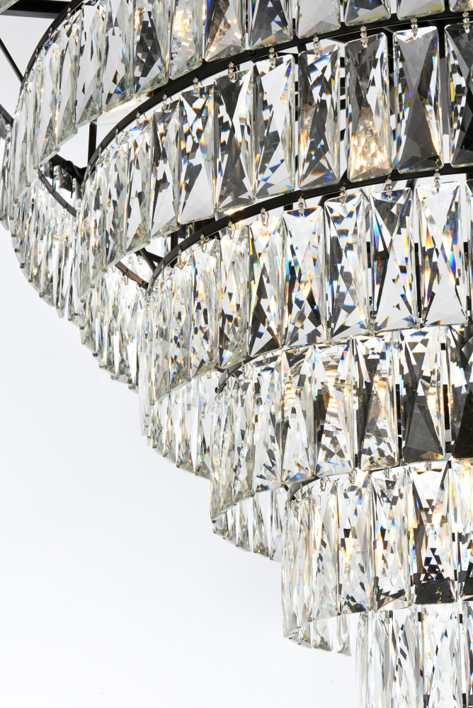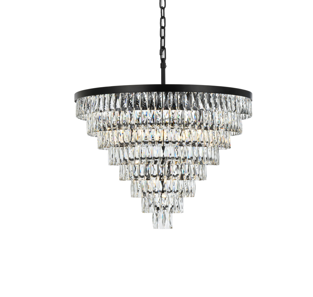 Transform your space with this extraordinary pendant that reimagines classical crystal design for contemporary interiors. The masterfully engineered silhouette features eight graduating tiers that create a spectacular inverted pyramid, reminiscent of a frozen cascade captured in mid-descent. Each precisely cut rectangular crystal is strategically positioned to maximize light play, creating mesmerizing displays of fractured light throughout your space. The substantial scale makes this fixture an ideal centerpiece for grand entryways, sophisticated dining rooms, or executive offices. The thoughtful construction incorporates 29 light sources distributed throughout the tiers, ensuring both spectacular illumination and enchanting crystal animation. The robust iron framework provides a secure foundation while maintaining visual lightness, allowing the crystals to appear as if floating in space. Available in reflective chrome, sophisticated black, or warm satin gold, this pendant makes an unforgettable statement while maintaining refined restraint. The cascading arrangement creates a sense of movement and flow, while the geometric precision of each crystal adds contemporary edge to the classical form. This is more than a light fixture – it's an architectural feature that transforms your space through its commanding presence and spectacular light performanc