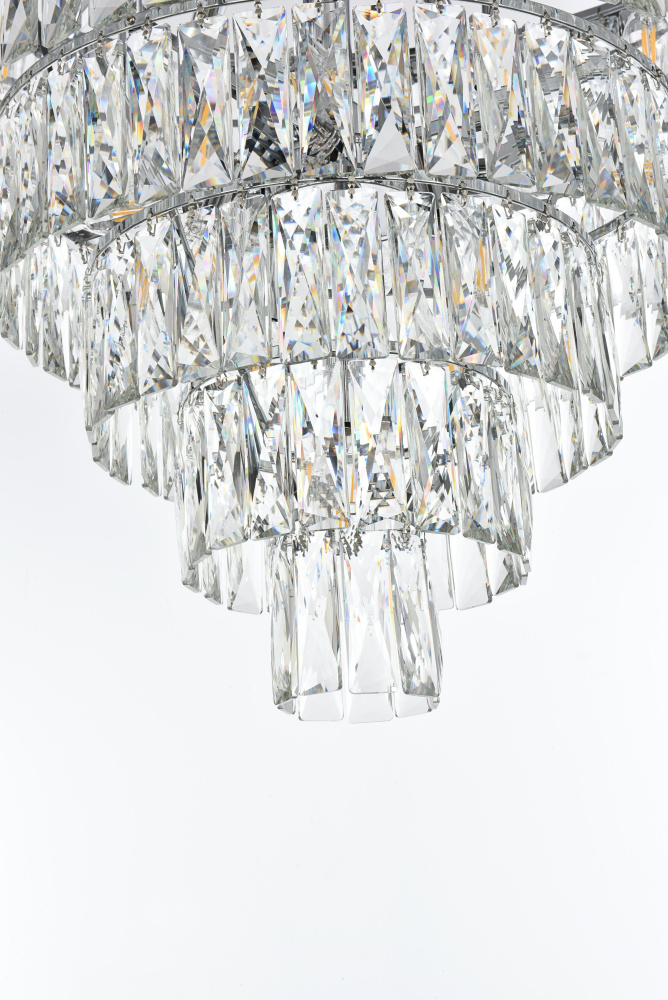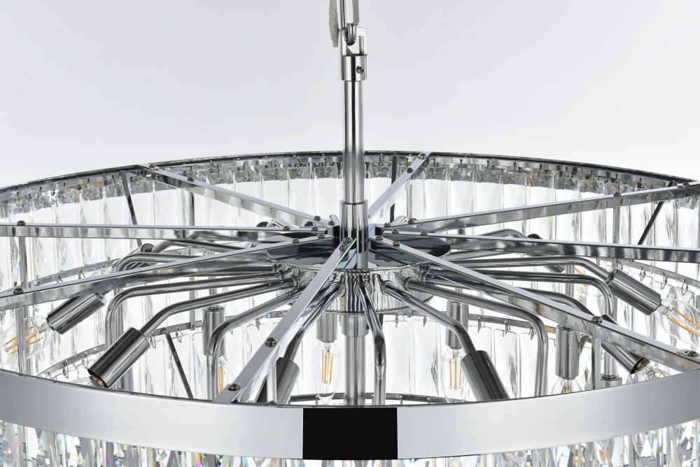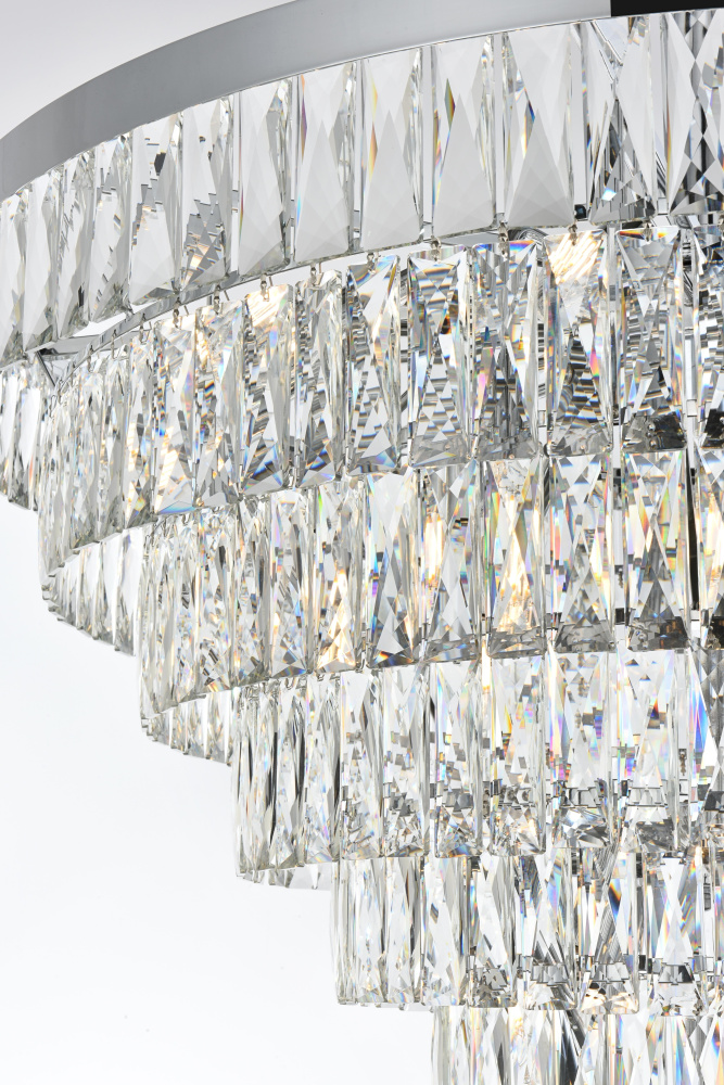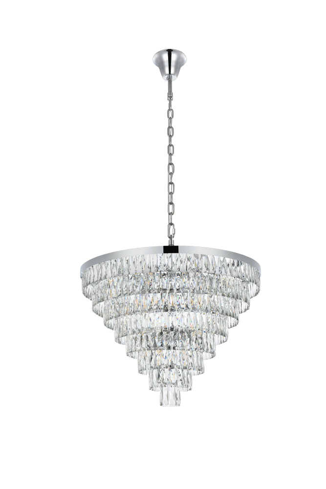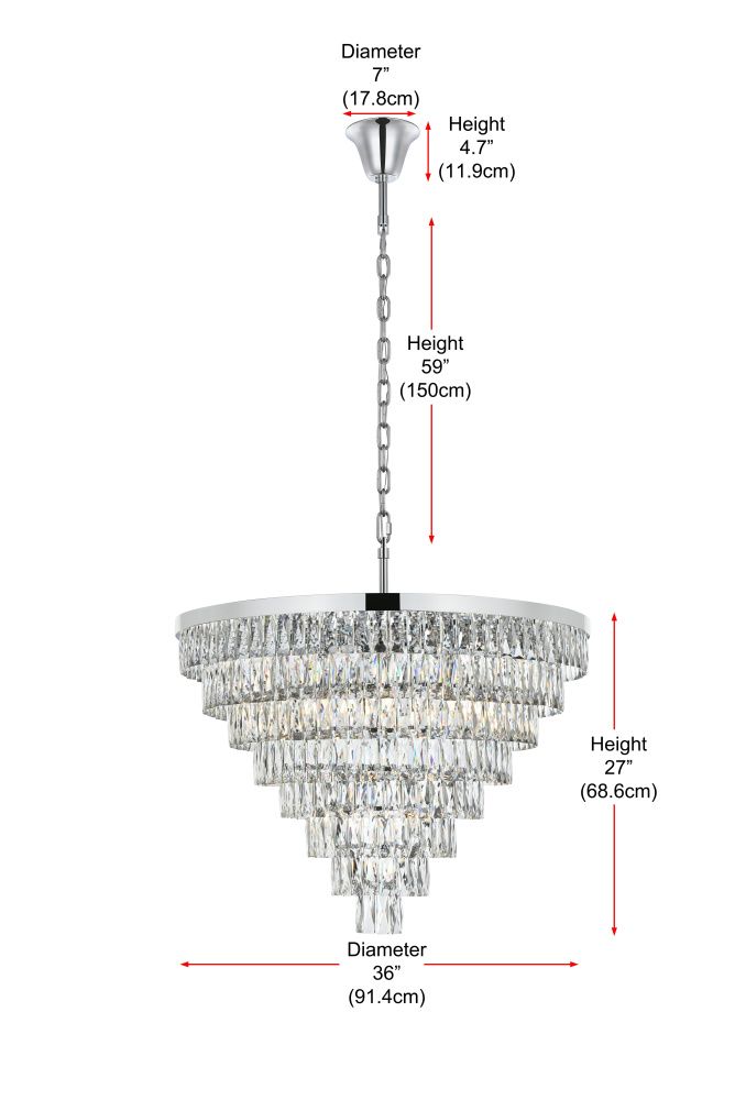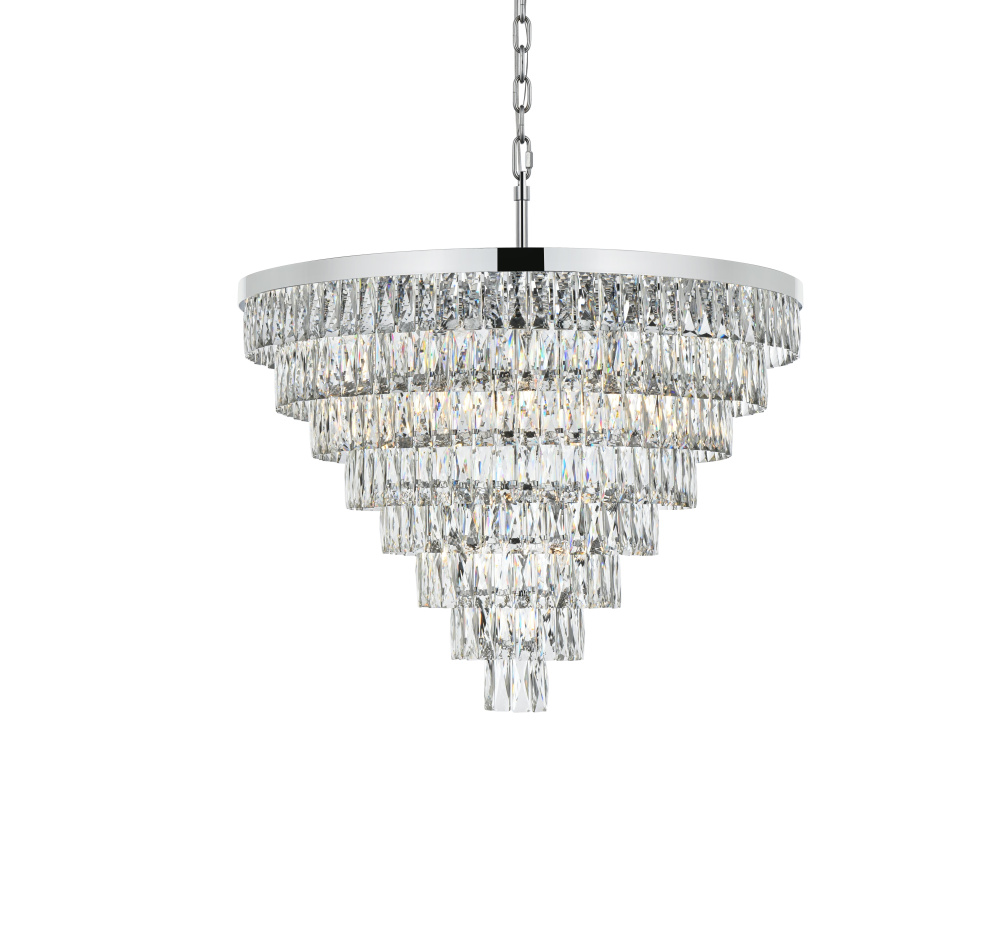 Transform your space with this extraordinary pendant that reimagines classical crystal design for contemporary interiors. The masterfully engineered silhouette features eight graduating tiers that create a spectacular inverted pyramid, reminiscent of a frozen cascade captured in mid-descent. Each precisely cut rectangular crystal is strategically positioned to maximize light play, creating mesmerizing displays of fractured light throughout your space. The substantial scale makes this fixture an ideal centerpiece for grand entryways, sophisticated dining rooms, or executive offices. The thoughtful construction incorporates 29 light sources distributed throughout the tiers, ensuring both spectacular illumination and enchanting crystal animation. The robust iron framework provides a secure foundation while maintaining visual lightness, allowing the crystals to appear as if floating in space. Available in reflective chrome, sophisticated black, or warm satin gold, this pendant makes an unforgettable statement while maintaining refined restraint. The cascading arrangement creates a sense of movement and flow, while the geometric precision of each crystal adds contemporary edge to the classical form. This is more than a light fixture – it's an architectural feature that transforms your space through its commanding presence and spectacular light performanc