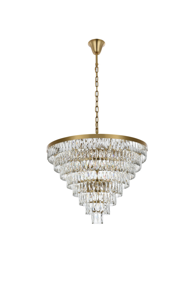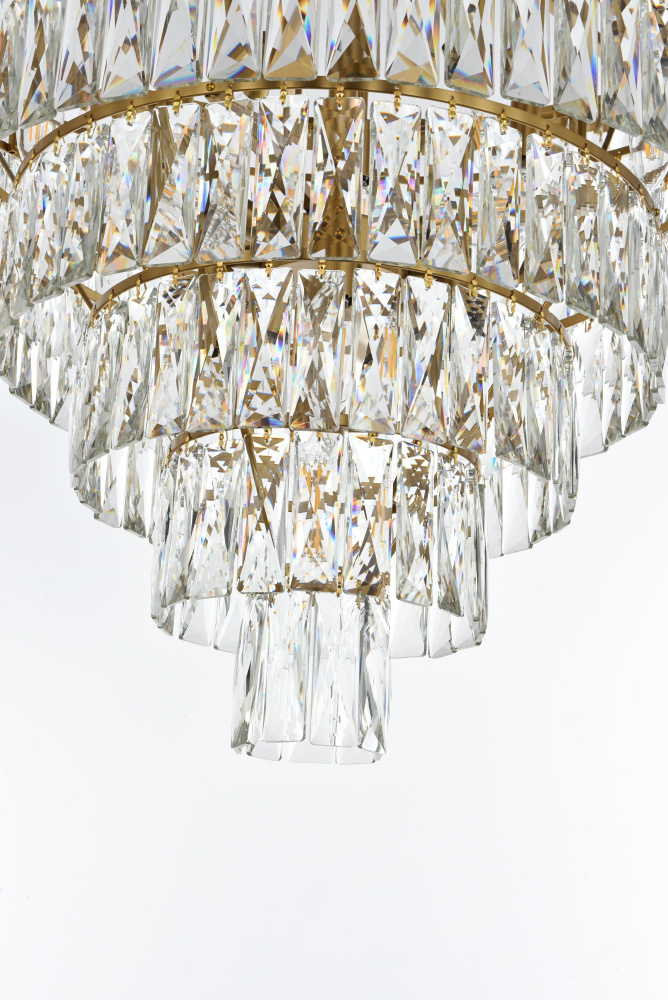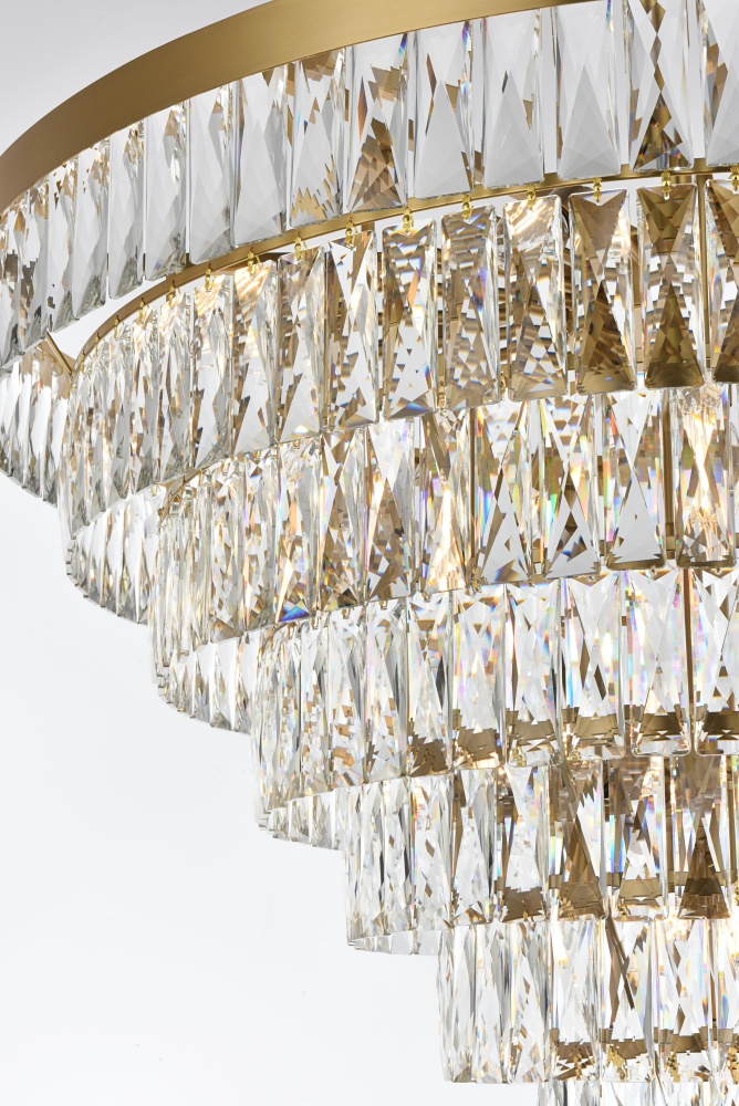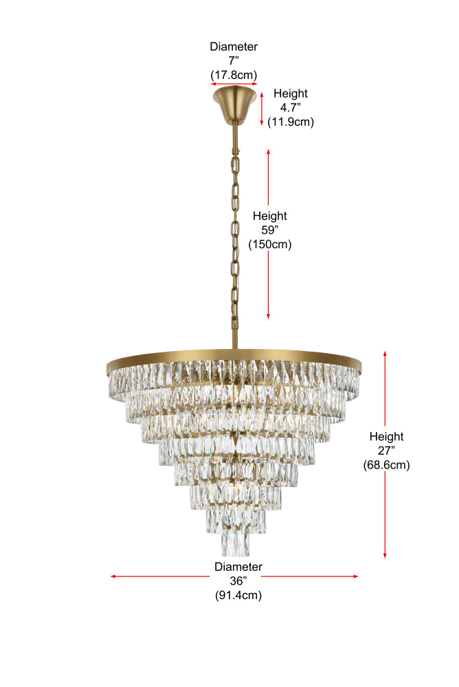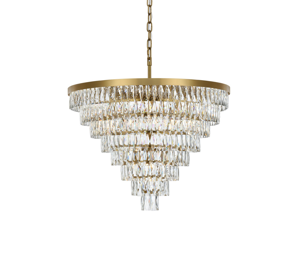 Transform your space with this extraordinary pendant that reimagines classical crystal design for contemporary interiors. The masterfully engineered silhouette features eight graduating tiers that create a spectacular inverted pyramid, reminiscent of a frozen cascade captured in mid-descent. Each precisely cut rectangular crystal is strategically positioned to maximize light play, creating mesmerizing displays of fractured light throughout your space. The substantial scale makes this fixture an ideal centerpiece for grand entryways, sophisticated dining rooms, or executive offices. The thoughtful construction incorporates 29 light sources distributed throughout the tiers, ensuring both spectacular illumination and enchanting crystal animation. The robust iron framework provides a secure foundation while maintaining visual lightness, allowing the crystals to appear as if floating in space. Available in reflective chrome, sophisticated black, or warm satin gold, this pendant makes an unforgettable statement while maintaining refined restraint. The cascading arrangement creates a sense of movement and flow, while the geometric precision of each crystal adds contemporary edge to the classical form. This is more than a light fixture – it's an architectural feature that transforms your space through its commanding presence and spectacular light performanc