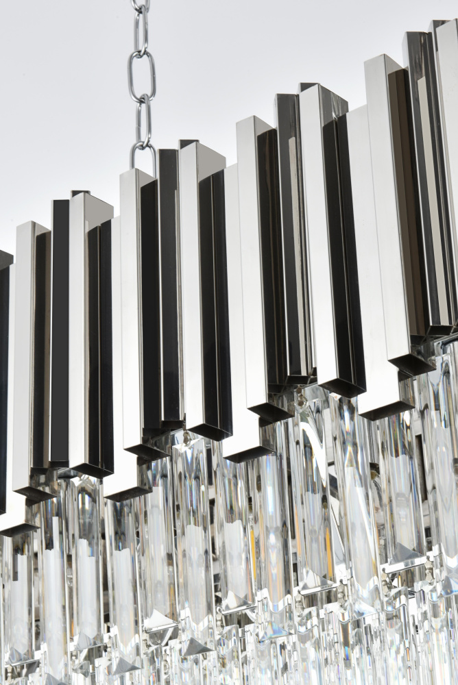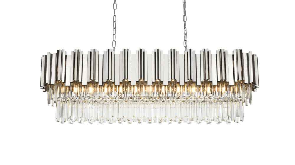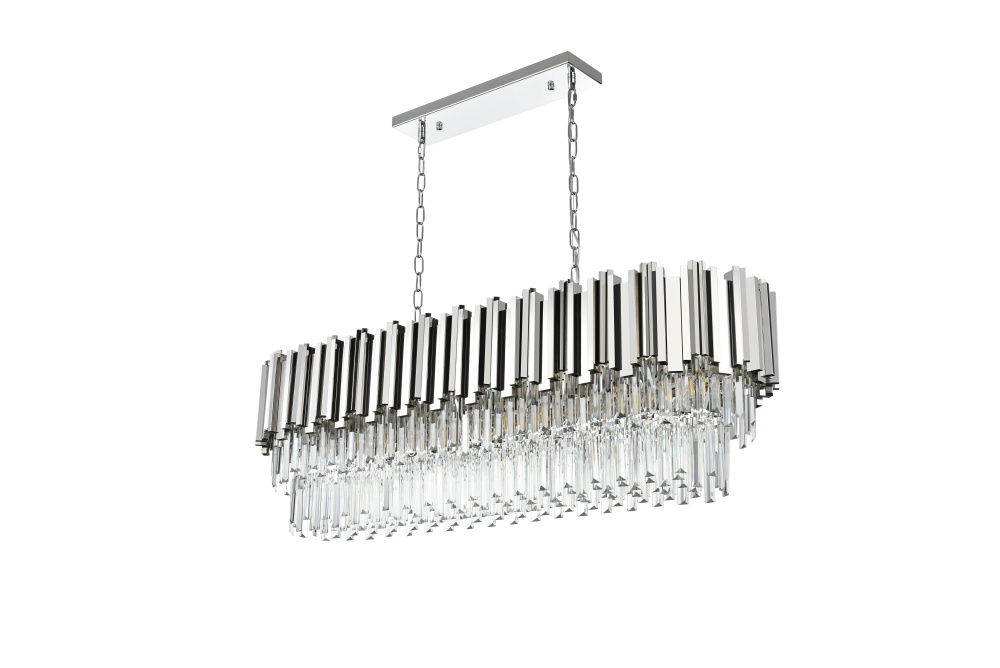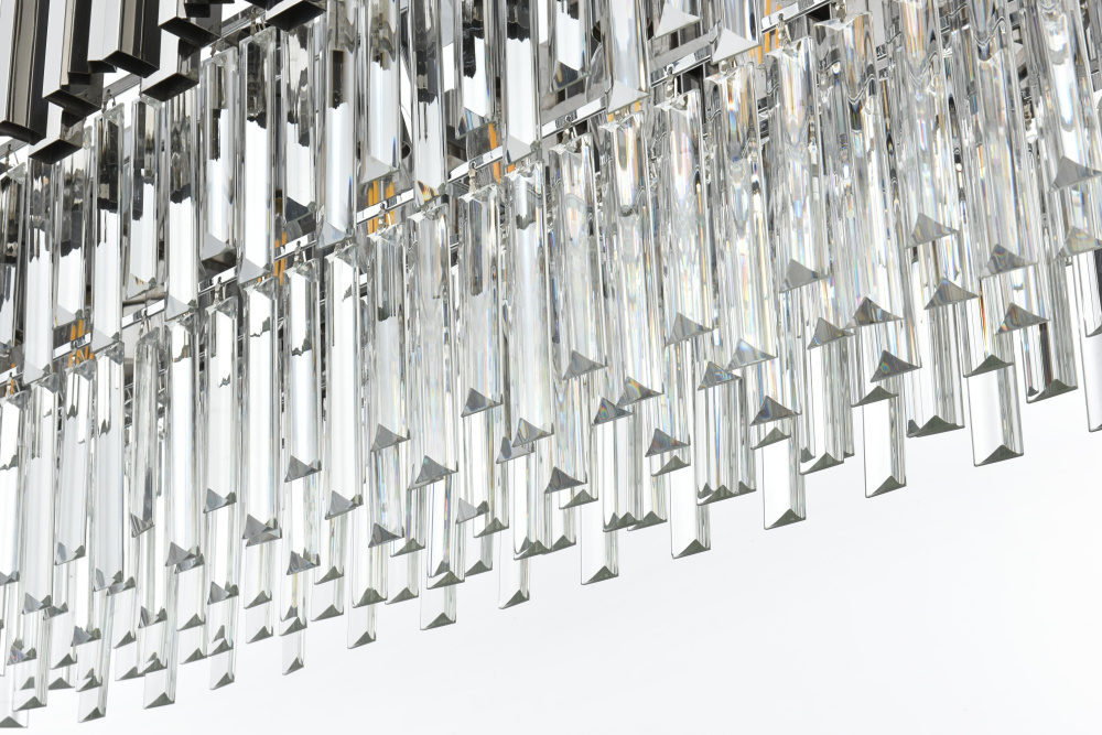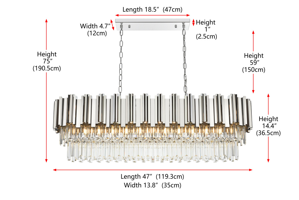 Make a bold statement with this stunning rectangular chandelier, where modern geometry meets luminous artistry. Featuring a sturdy iron frame with a staggered design and cascading clear glass accents, this fixture refracts light into a dazzling array of brilliance, creating a dynamic interplay of light and shadow. The dramatic black finish complements the shimmering glass, emphasizing the sleek, contemporary design. Perfect for dining rooms, spacious living areas, or professional settings, this chandelier transforms any space into a radiant centerpiece. Fully dimmable, it allows you to customize the ambiance to suit any occasion. Complete with a matching canopy and easy installation, this chandelier redefines modern lighting with its bold structure and captivating glow.
