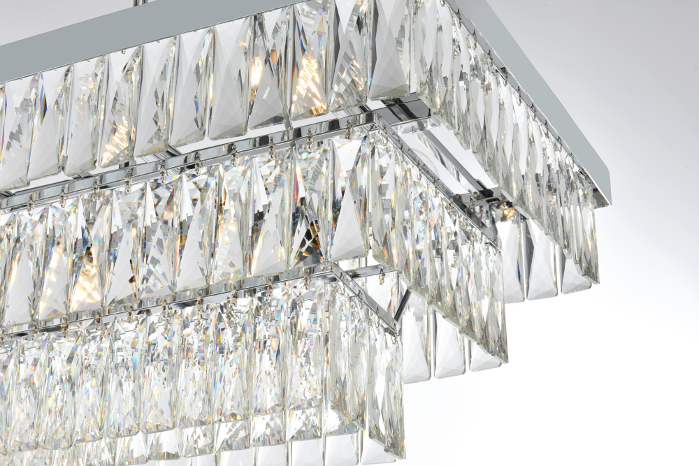 Three distinct crystal tiers form a stunning stepped silhouette beneath the linear frame.