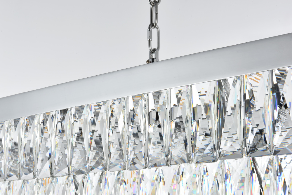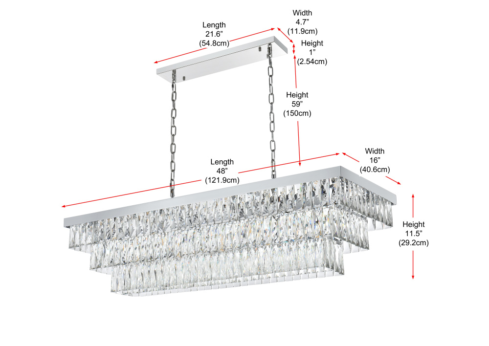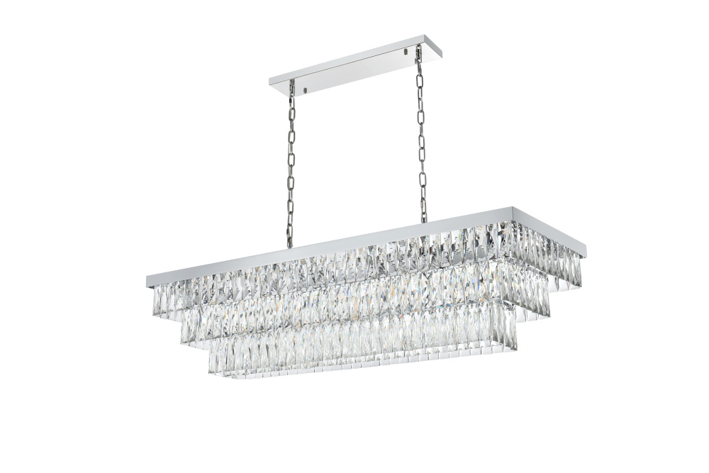 Transform your space with this spectacular linear pendant that reinvents crystal lighting for contemporary interiors. The bold rectangular frame suspends two perfectly proportioned crystal tiers, creating a mesmerizing interplay of light and structure. Each precisely cut crystal is strategically positioned to maximize light play, producing brilliant refractions that dance across your space. The strong horizontal presence makes this fixture an ideal centerpiece above dining tables, conference rooms, or in grand living spaces. The thoughtful construction marries industrial strength with crystalline delicacy, as the robust metal frame appears to float above while supporting the spectacular crystal arrangement. Whether styled in reflective chrome, sophisticated black, or warm satin gold, this pendant commands attention through its architectural presence. The linear composition offers a fresh interpretation of crystal lighting, where clean lines and geometric precision meet the spectacular light performance of premium crystal. This fixture doesn't merely illuminate – it defines space through its commanding horizontal presence while creating an ever-changing display of light and shado