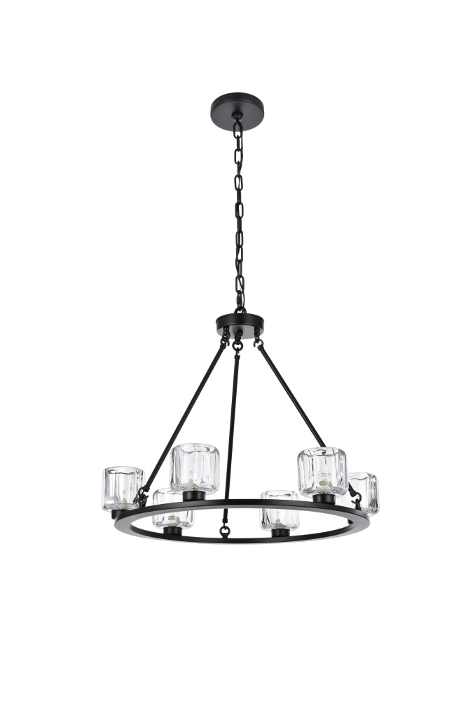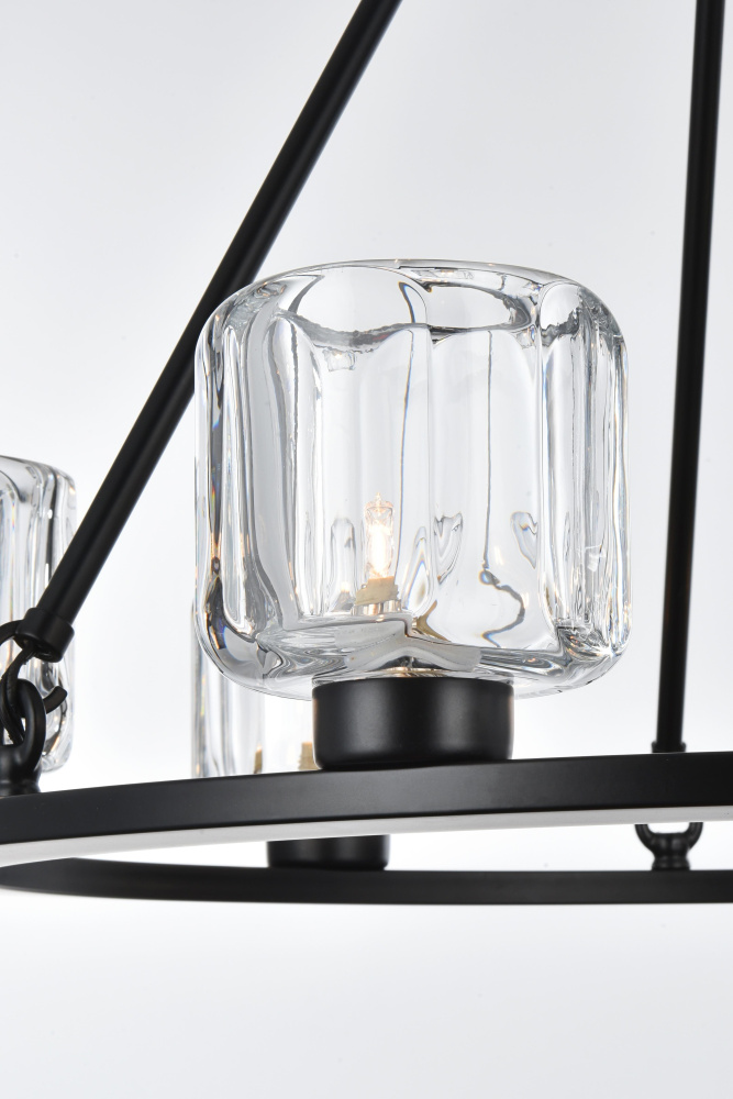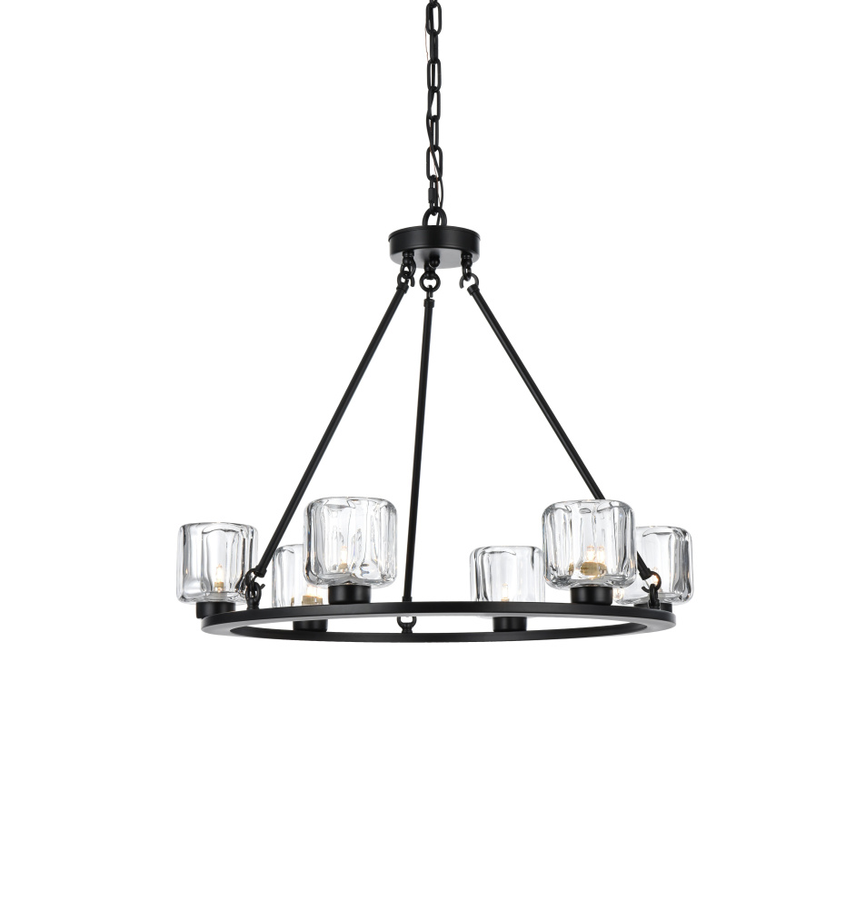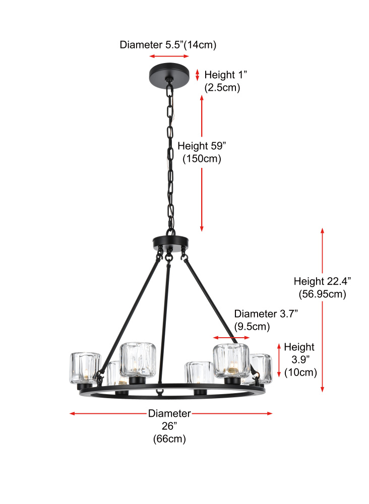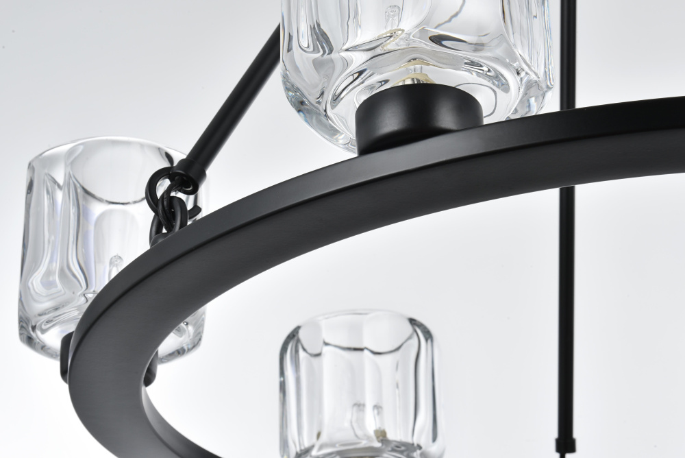 Add modern charm to your space with this striking chandelier, where a sleek circular iron frame meets sculpted clear glass shades. The unique design features decorative hanging rods with hooks, enhancing the structure with industrial flair. The clear glass refracts light beautifully, creating a radiant glow that uplights your space with warmth and dimension. Perfect for dining rooms, living rooms, or offices, this chandelier is available in black for a bold contrast, satin gold for a luxurious touch, and chrome for a sleek, modern vibe. With multiple size options and a matching canopy and chain for seamless installation, this dimmable chandelier offers both beauty and versatility. Light bulbs are not included, allowing you to choose the perfect style to match your vision.