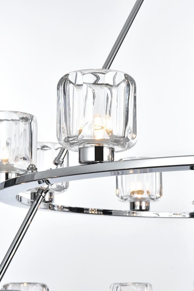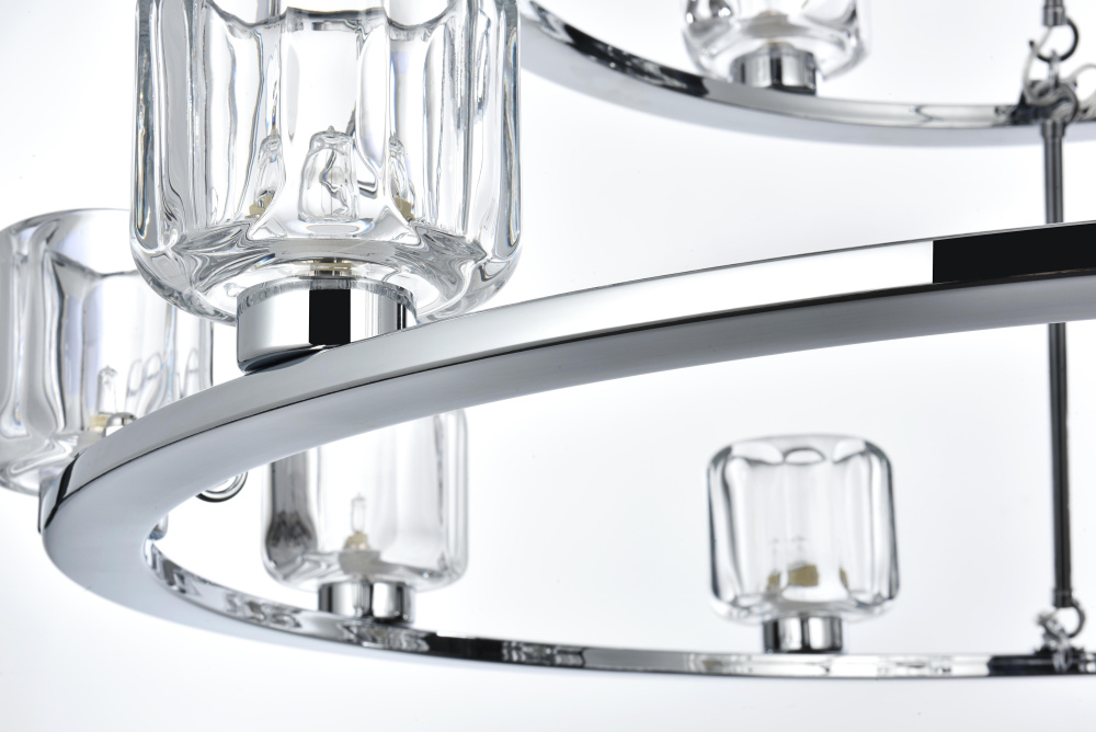 Add modern charm to your space with this striking chandelier, where a sleek circular iron frame meets sculpted clear glass shades. The unique design features decorative hanging rods with hooks, enhancing the structure with industrial flair. The clear glass refracts light beautifully, creating a radiant glow that uplights your space with warmth and dimension. Perfect for dining rooms, living rooms, or offices, this chandelier is available in black for a bold contrast, satin gold for a luxurious touch, and chrome for a sleek, modern vibe. With multiple size options and a matching canopy and chain for seamless installation, this dimmable chandelier offers both beauty and versatility. Light bulbs are not included, allowing you to choose the perfect style to match your vision.