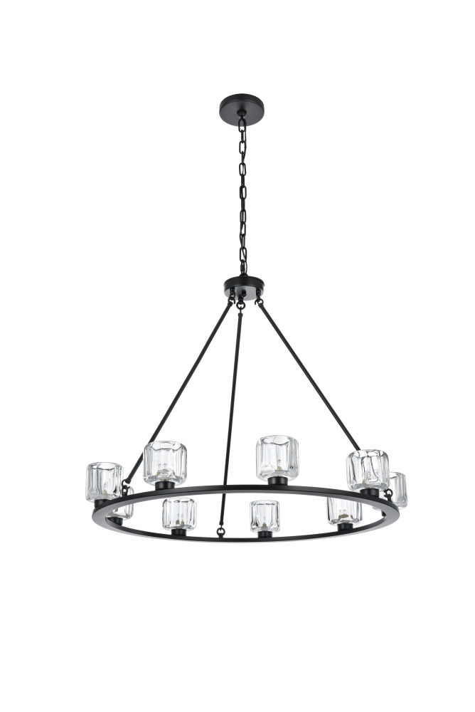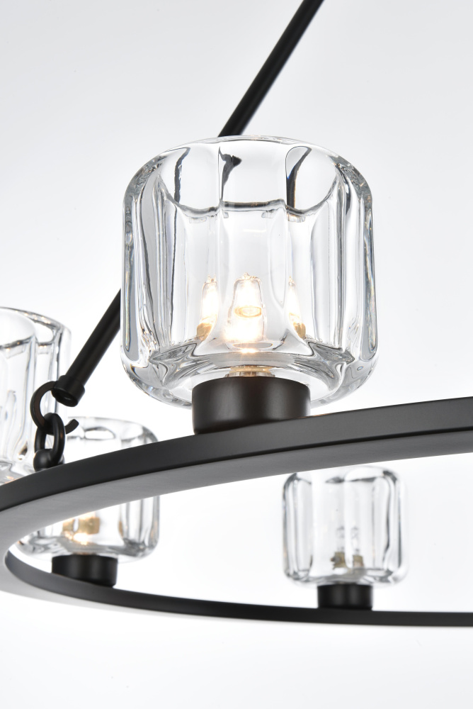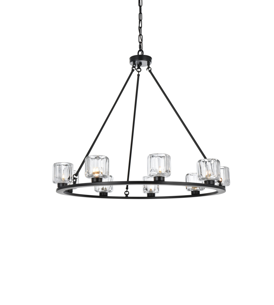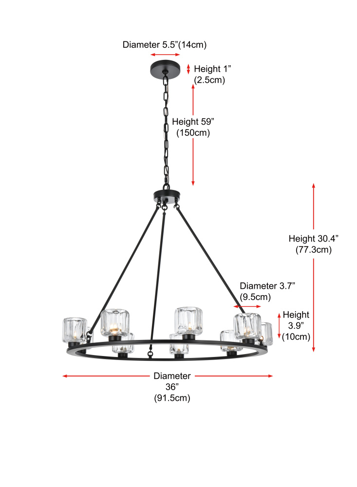 Add modern charm to your space with this striking chandelier, where a sleek circular iron frame meets sculpted clear glass shades. The unique design features decorative hanging rods with hooks, enhancing the structure with industrial flair. The clear glass refracts light beautifully, creating a radiant glow that uplights your space with warmth and dimension. Perfect for dining rooms, living rooms, or offices, this chandelier is available in black for a bold contrast, satin gold for a luxurious touch, and chrome for a sleek, modern vibe. With multiple size options and a matching canopy and chain for seamless installation, this dimmable chandelier offers both beauty and versatility. Light bulbs are not included, allowing you to choose the perfect style to match your vision.