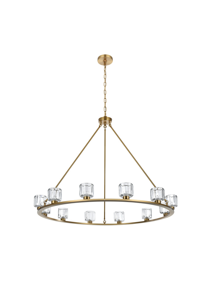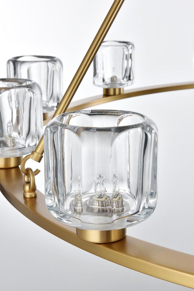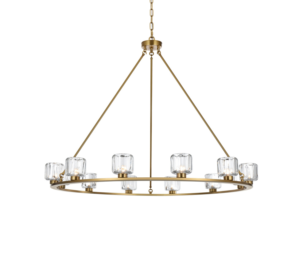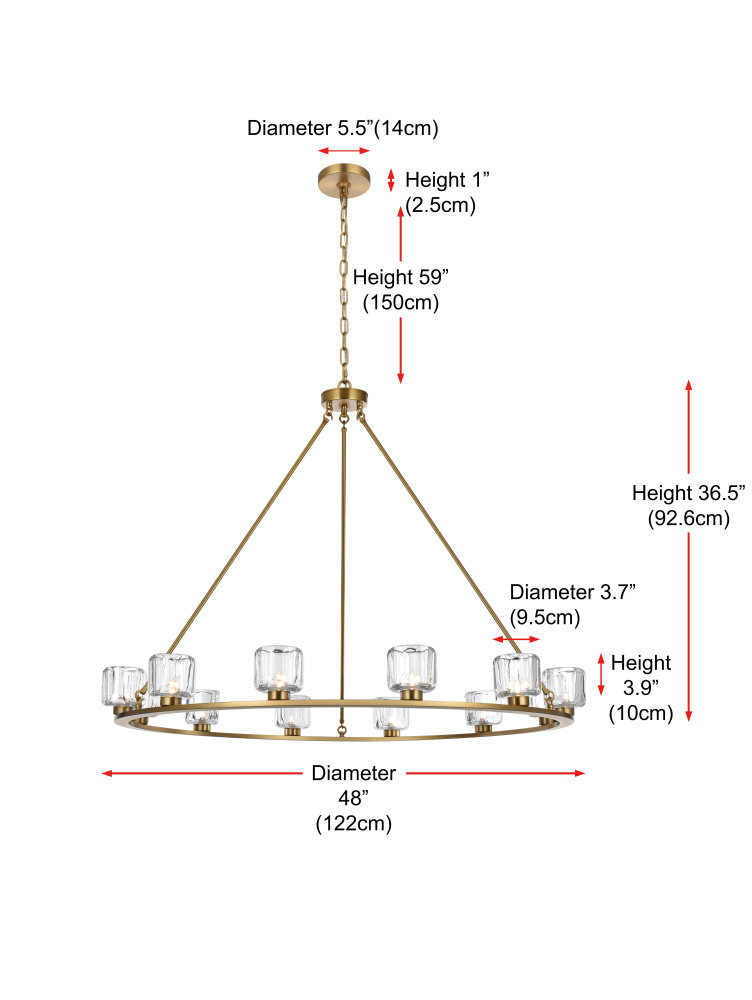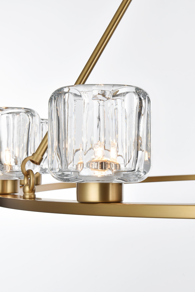 Add modern charm to your space with this striking chandelier, where a sleek circular iron frame meets sculpted clear glass shades. The unique design features decorative hanging rods with hooks, enhancing the structure with industrial flair. The clear glass refracts light beautifully, creating a radiant glow that uplights your space with warmth and dimension. Perfect for dining rooms, living rooms, or offices, this chandelier is available in black for a bold contrast, satin gold for a luxurious touch, and chrome for a sleek, modern vibe. With multiple size options and a matching canopy and chain for seamless installation, this dimmable chandelier offers both beauty and versatility. Light bulbs are not included, allowing you to choose the perfect style to match your vision.