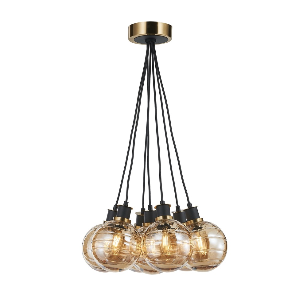 The Gem Collection with champagne glassware has a rich, translucent amber hue with a high level of clarity, allowing light to pass through while casting a warm, golden tone. The model shown is a 7 lite height adjustable cluster type chandelier.