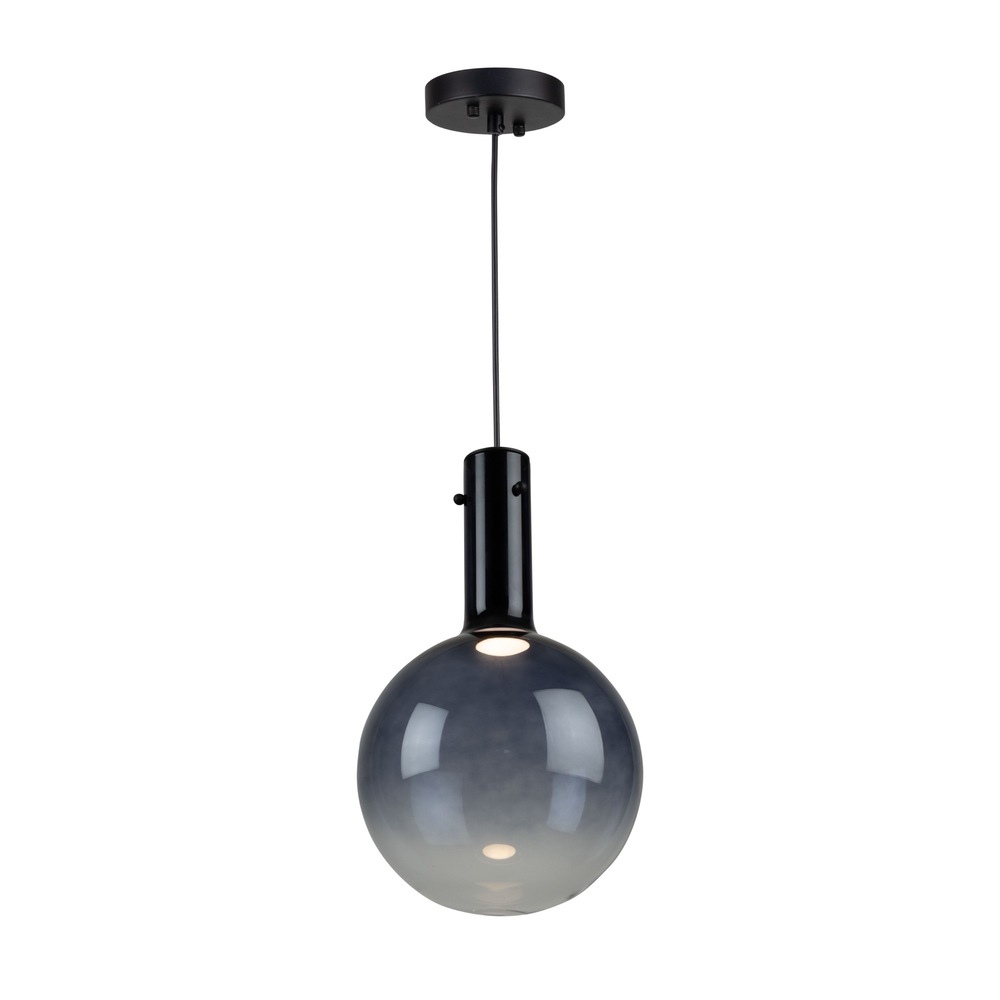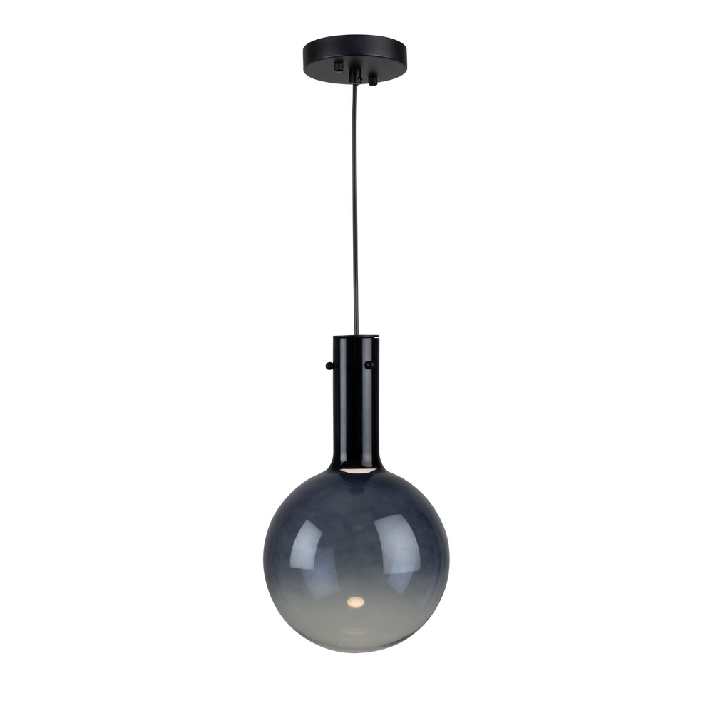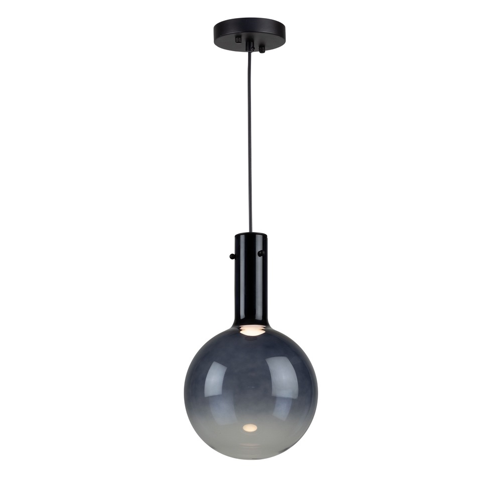 The Alexis pendant collection showcases a stunning design with spherical ombre-type glassware, featuring a captivating gradient of color that transitions seamlessly from vibrant hues at the top to a clear bottom. The Alexis is enhanced by energy-efficient LED illumination, providing a contemporary and visually striking addition to any space. Shown in blue (also available in gold, coffee, or chrome). (Easily height adjustable)