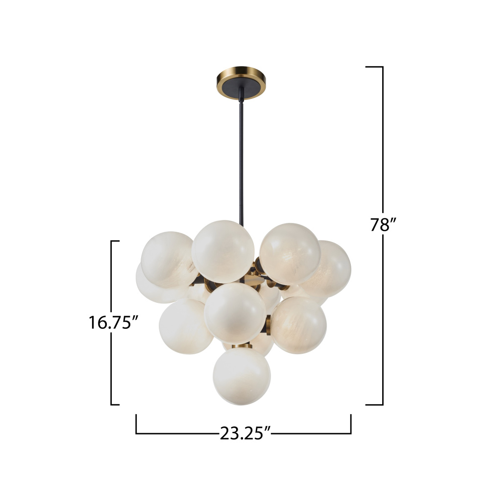 The Gem collection with “Blizzard” glassware exudes a sense of sophistication. Featuring a glossy textured white, the glass glows giving it a timeless and contemporary feel. The combination of the black framing with brushed brass is simply exquisite. The model shown is a height adjustable 13 lite, 3 tier chandelier.
