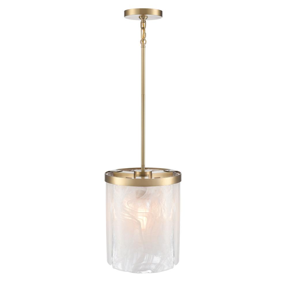 This stunning pendant light exudes timeless elegance, blending a brushed brass frame with the ethereal beauty of wispy white Murano-style glass panels. Its cylindrical silhouette radiates sophistication, creating a soft, ambient glow perfect for intimate spaces. The craftsmanship of the Skye collection by designer Kevin Kraemer is evident in the graceful harmony between its materials and design. This piece serves as both a functional light source and a work of art, elevating any room with its luxurious charm. (This model can be used as a pendant or shortened to be a semi-flushmount for close to ceiling needs)
