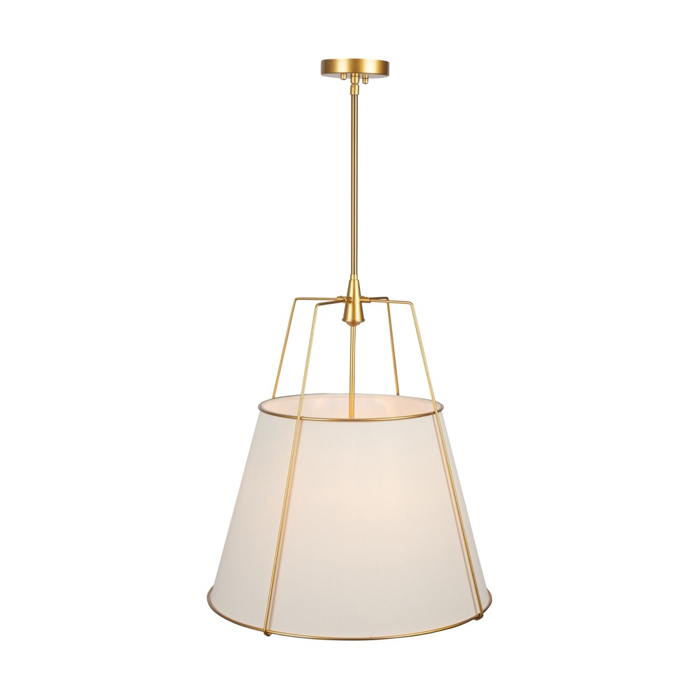 Designed by Steven Sabados (S&C), the Pullman Collection of linen shades is elegantly suspended by brass metal frames, seamlessly combining classic and modern design elements. The high-quality linen shades, gently tapered and expertly crafted, diffuse light to create a warm and inviting ambiance. With their timeless elegance and versatile aesthetics, these shades add a touch of sophistication to any space they grace. The model shown is a 4 lite 21" diameter pendant chandelier. (also available with black metalwork)