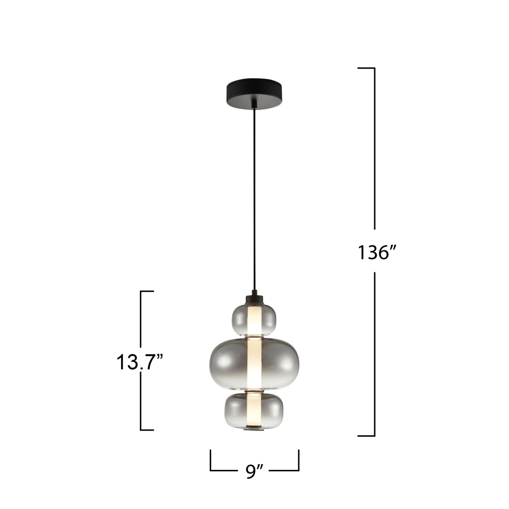 Illuminate your space with the Astra LED pendant, a striking embodiment of contemporary elegance and timeless allure. Featuring a radiant white LED inner tube, it is beautifully encased within three smoke ombre glass layers, creating a mesmerizing gradient effect. The sleek black frame adds an elegant contrast, making this piece a captivating centerpiece for any interior.