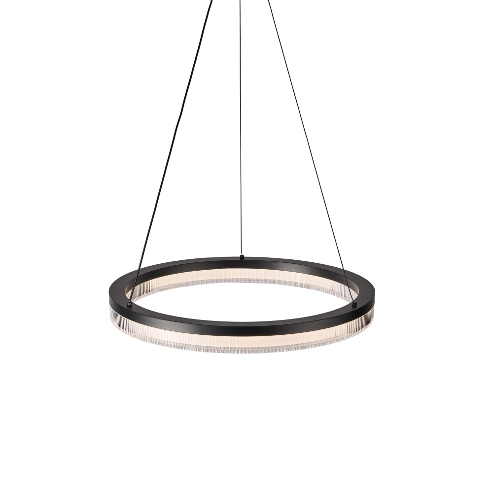 Elevate your space with the modern elegance of the LED chandelier from the Ari Collection. Its sleek black frame and ribbed clear bottom lens create a soft, mesmerizing glow. Suspended by adjustable aircraft type cables with a "push-pin" system, it offers both style and effortless versatility. This model has a 3CCT switch to choose the color temperature of your preference (3K, 4K, 5K).