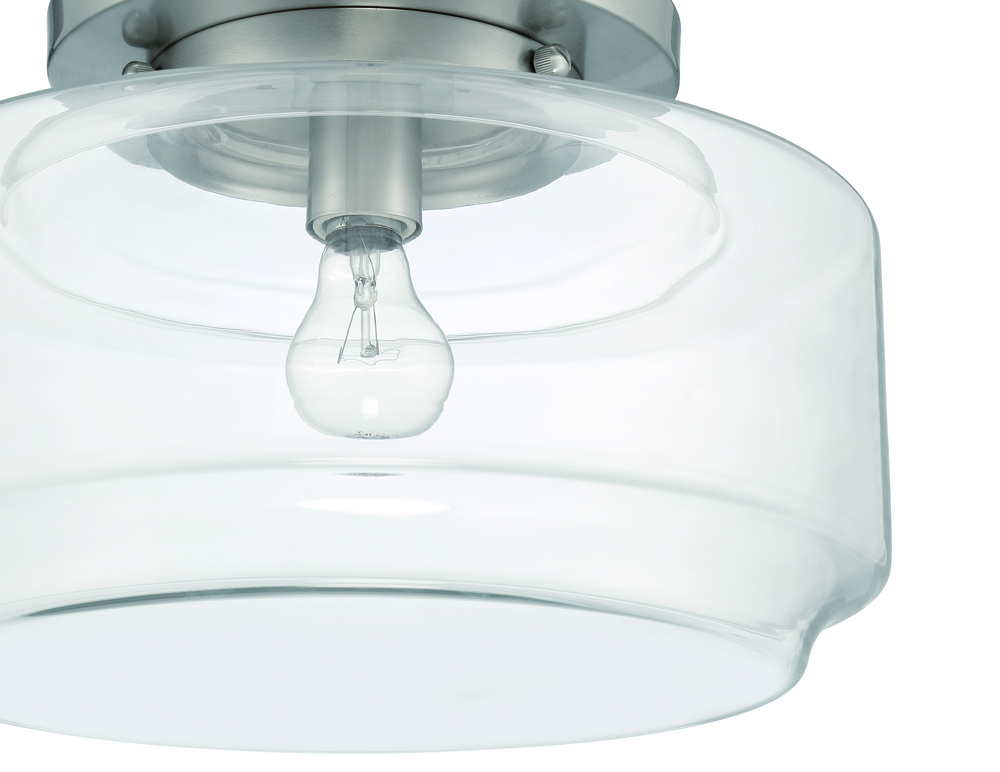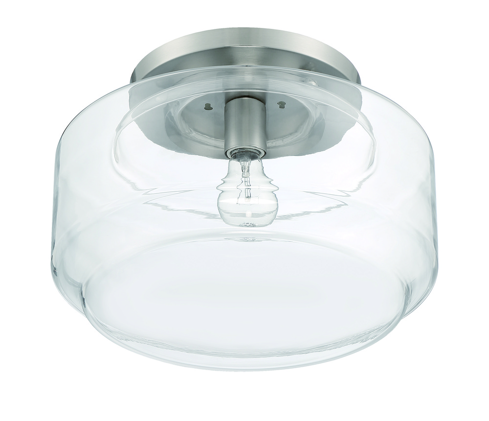 The Peri Collection by Craftmade, inspired by classic schoolhouse lights, features a wide clear glass globe in a familiar yet updated shape. Finished in your choice of brushed polished nickel, flat black or satin brass, these flushmounts are available in 12" and 14" diameter and each uses a single 60W medium base bulb.