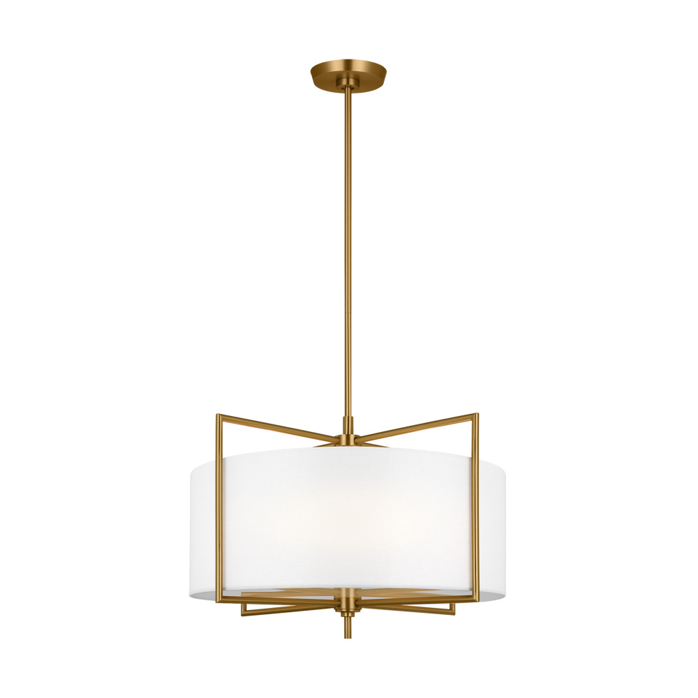 The Perno four-light shade pendant in Burnished Brass by Chapman and Myers was inspired by a vintage mid-century French sconce with a simple metal armature. The minimal cruciform structure of the metal frame is the main feature of the design. The frame outlines and supports the inner cylindrical shade. All of the assembly hardware for installing the inner shade was engineered to be hidden in order to maintain the clean and simple aesthetic of the light.