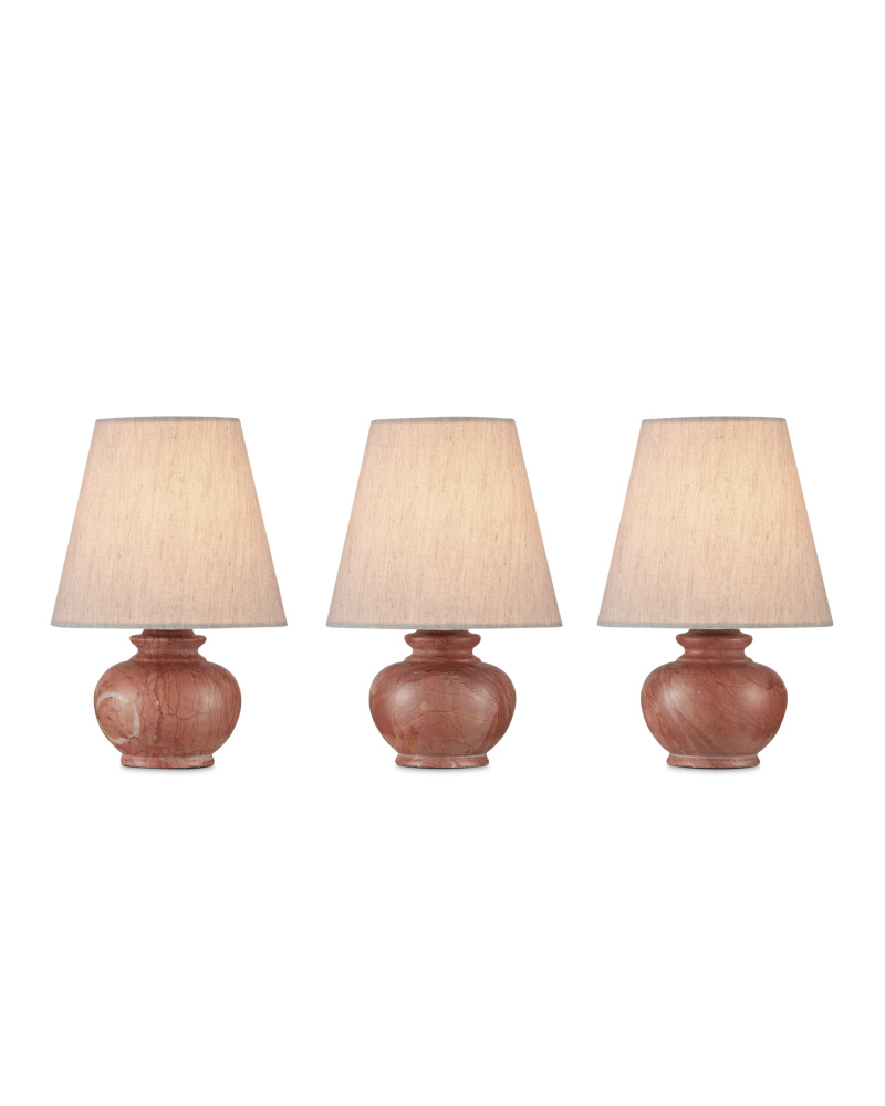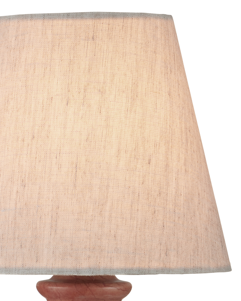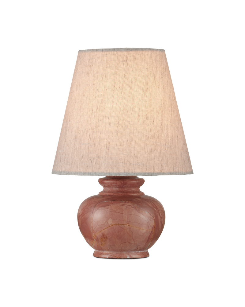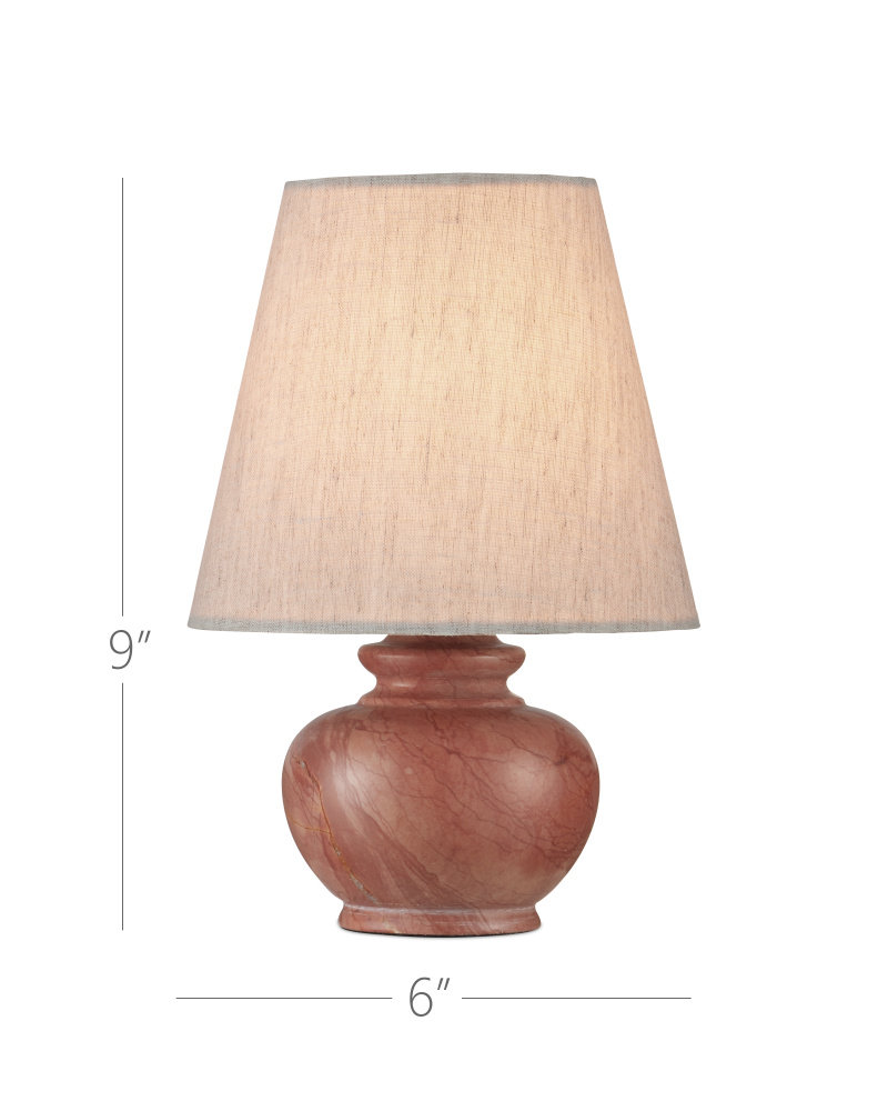 The Piccolo Pink Mini Table Lamp is a very petite lamp made of Rosa Cappuccino marble that was modeled after a vintage design. At only 4.5 inches high to the shade, it fits into most tight spots like bookcases, though the beauty of the natural material will make it a standout in more commanding decorative arrangements. Because the marble is a stone, no two lamps will be exactly alike. The Piccolo is fitted with an off-white linen shade.