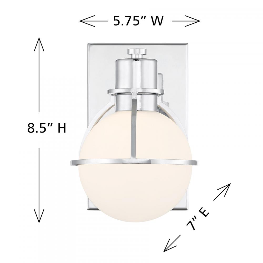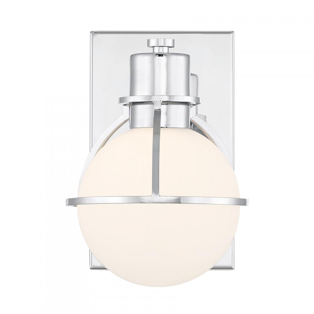 The Savoy House Pierce 1-light sconce offers up a retro, factory-inspired style that makes it an excellent choice for stylish bathroom lighting. A slender, curving half-cage finished in Chrome securely holds an orb of white opal glass that will provide a bright and welcoming glow. Pierce is 8.5" in height, 5.75" in width and extends 7" from the wall. Uses one G9 style bulb of up to 60 watts. Bulb not included. Install as shown. This sconce is damp area rated.