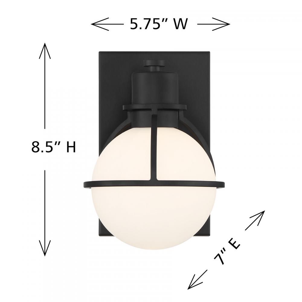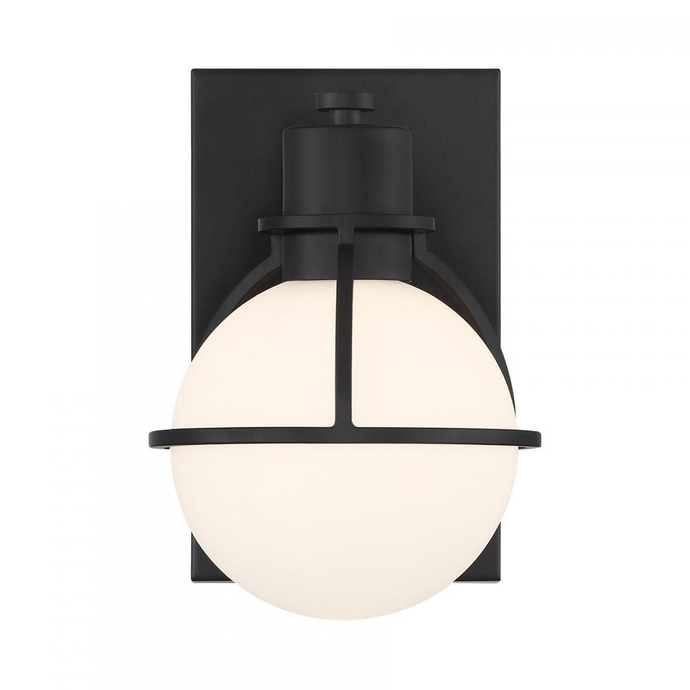 The Savoy House Pierce 1-light sconce offers up a retro, factory-inspired style that makes it an excellent choice for stylish bathroom lighting. A slender, curving half-cage finished in Black securely holds an orb of white opal glass that will provide a bright and welcoming glow. Pierce is 8.5" in height, 5.75" in width and extends 7" from the wall. Uses one G9 style bulb of up to 60 watts. Bulb not included. Install as shown. This sconce is damp area rated.