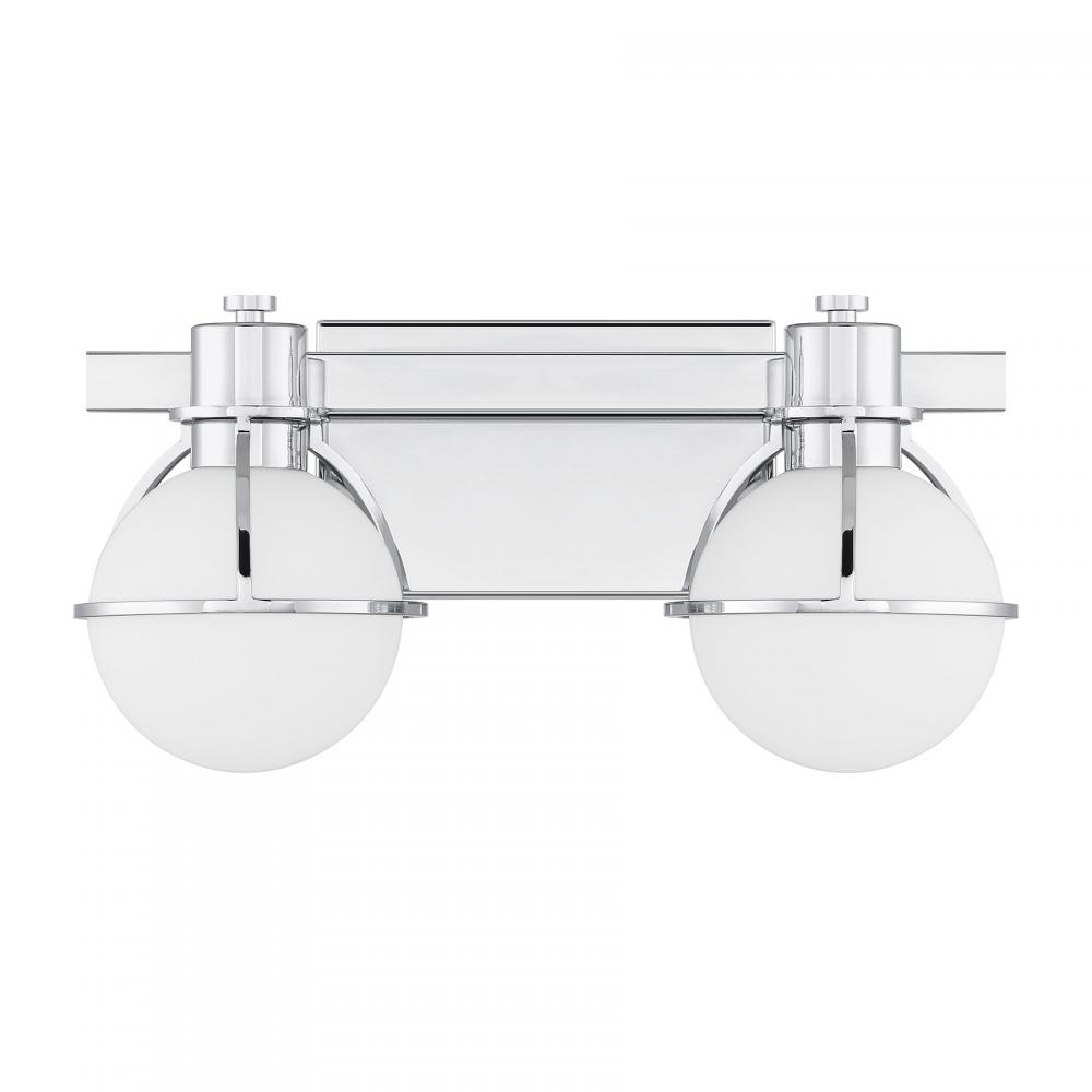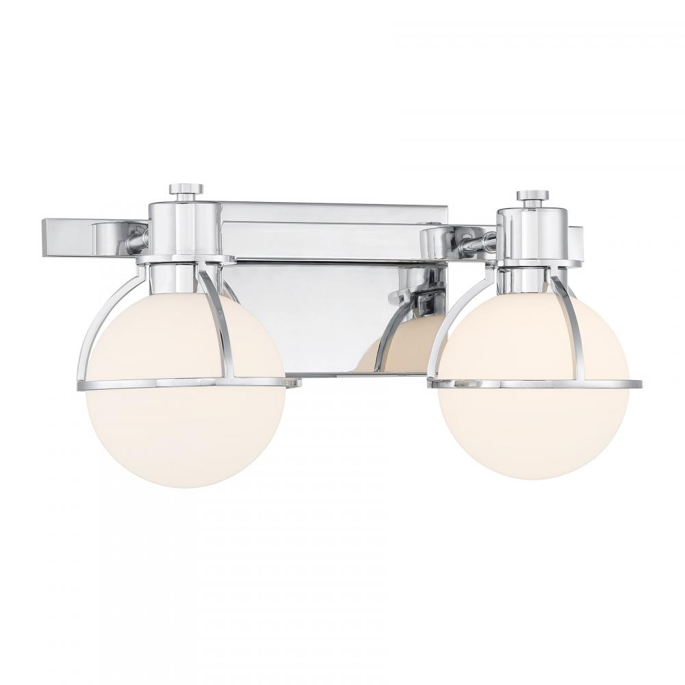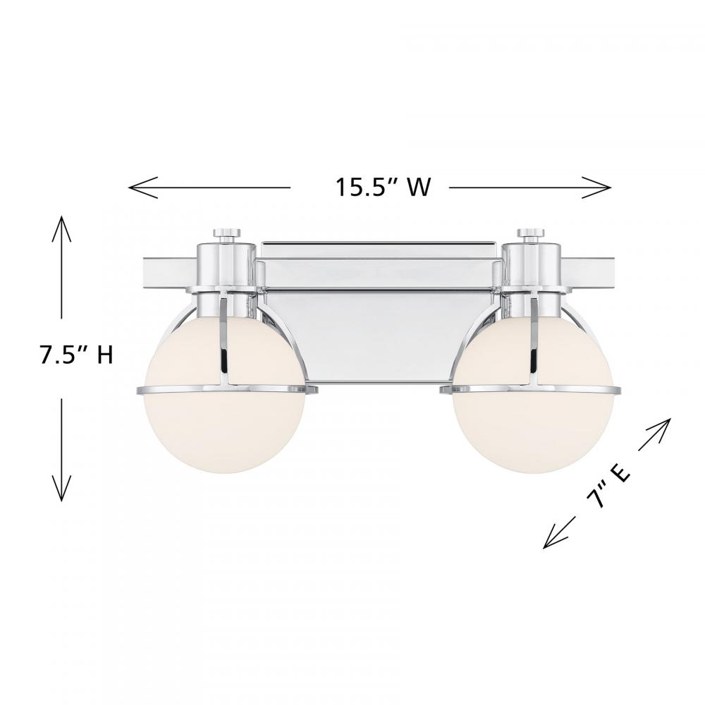 The Savoy House Pierce 2-light bath light offers up a retro, factory-inspired style that makes it an excellent choice for stylish bathroom lighting. Slender, curving half-cages finished in Chrome securely hold orbs of white opal glass that will provide a bright and welcoming glow. Pierce is 7.5" in height, 15.5" in width and extends 7" from the wall. Uses two G9 style bulbs of up to 60 watts per bulb. Bulbs not included. Install as shown. This bath bar is damp area rated.