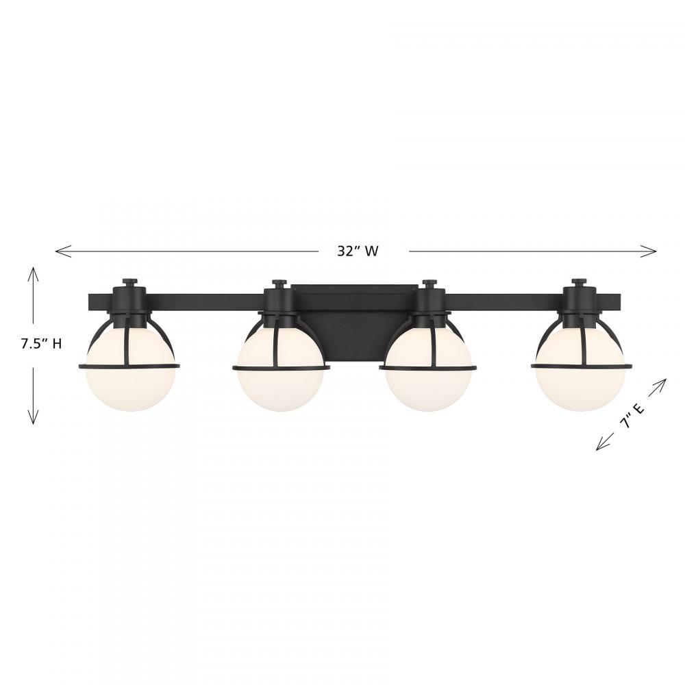 The Savoy House Pierce 4-light bath light offers up a retro, factory-inspired style that makes it an excellent choice for stylish bathroom lighting. Slender, curving half-cages finished in Black securely hold orbs of white opal glass that will provide a bright and welcoming glow. Pierce is 7.5" in height, 32" in width and extends 7" from the wall. Uses four G9 style bulbs of up to 60 watts per bulb. Bulbs not included. Install as shown. This bath bar is damp area rated.