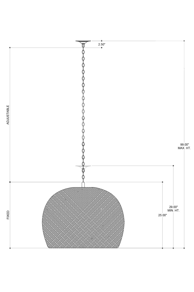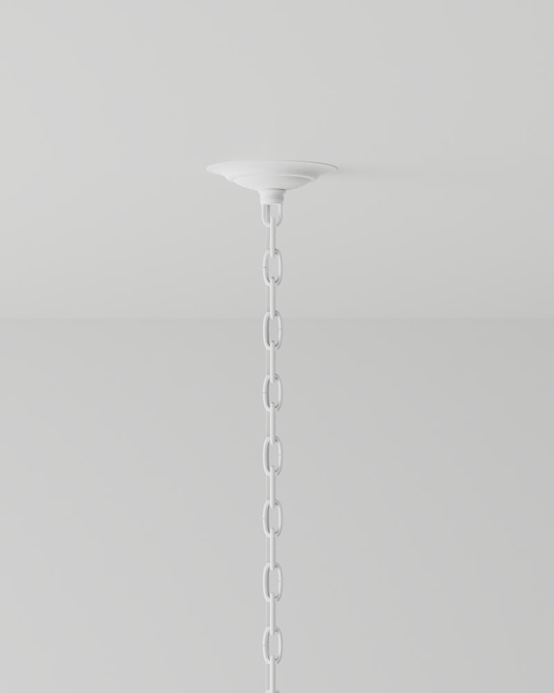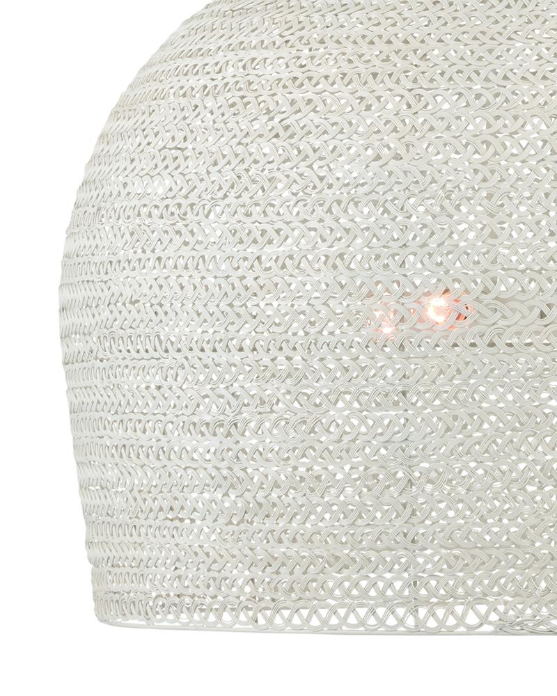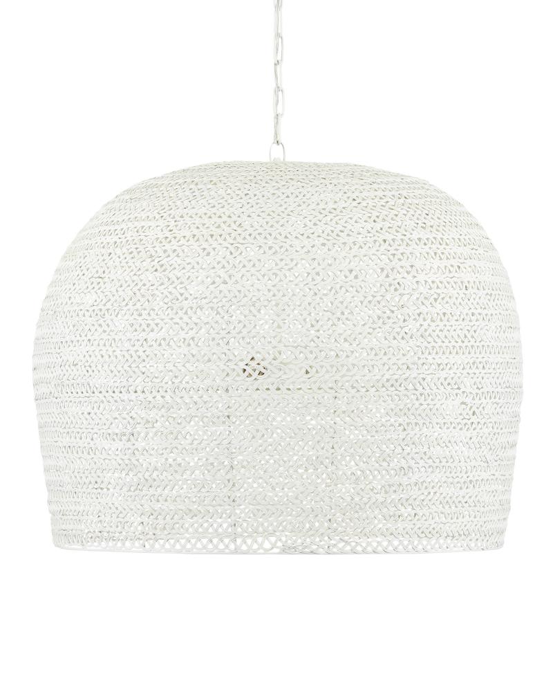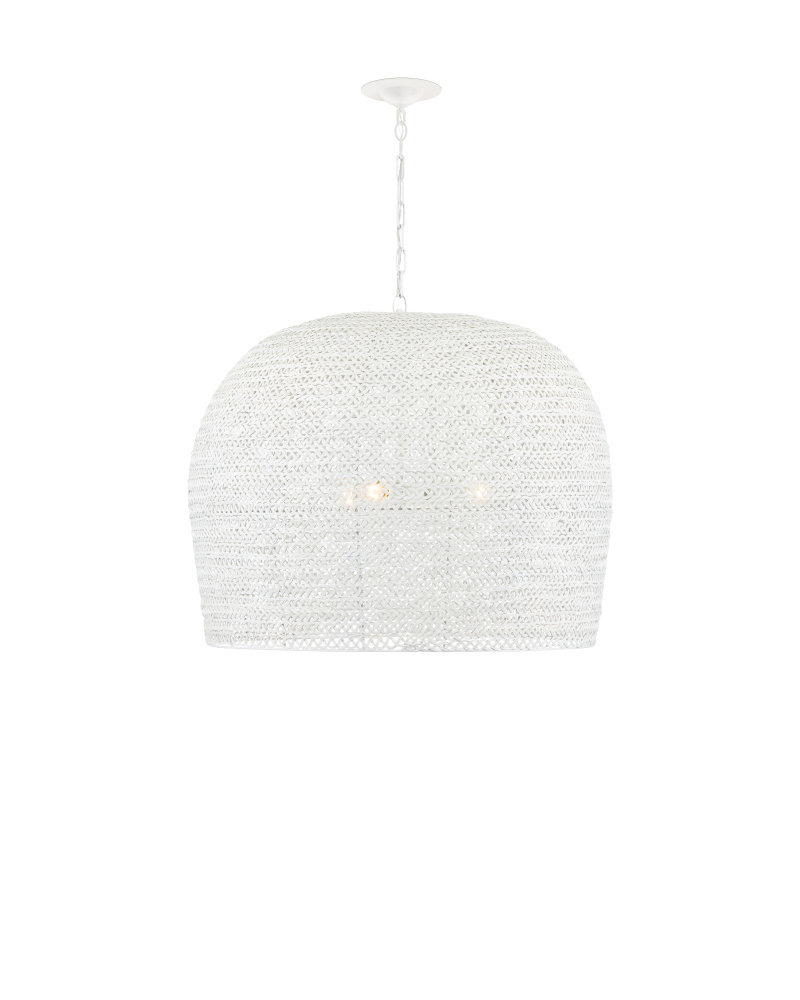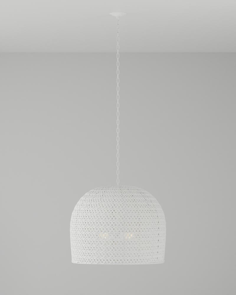 The Piero White Large Chandelier may appear to be woven from a natural plant material, but it is made of iron in a white finish to make it one of our offerings that illustrates the skills that our craftspeople bring to their work. When the white chandelier is illuminated, textural patterns will enliven surrounding surfaces. Adjustable from 29" to 99" with use of included chain/rod kit/cable. If your space calls for a longer drop, additional chain/rods/cable is available for purchase.