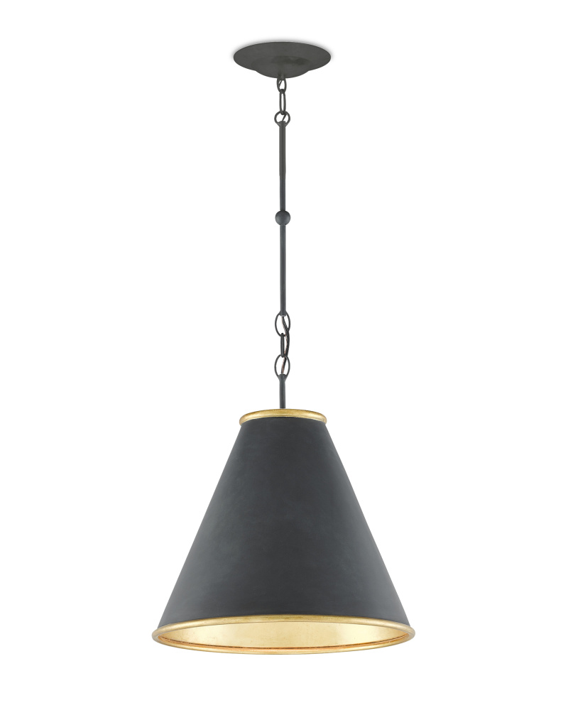 Our Pierrepont Black Small Pendant is made of wrought iron with an antique black finish on its exterior and a contemporary gold leaf finish on the interiors of the shades. The rings connecting them gleam in a painted gold finish. There are a number of other sizes and finishes in the Pierrepont family of fixtures. Adjustable from 22" to 100" with use of included chain/rod kit/cable. If your space calls for a longer drop, additional chain/rods/cable is available for purchase.
