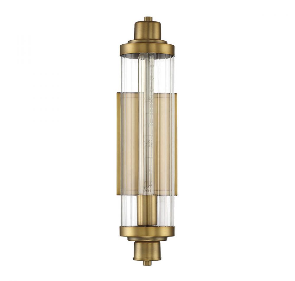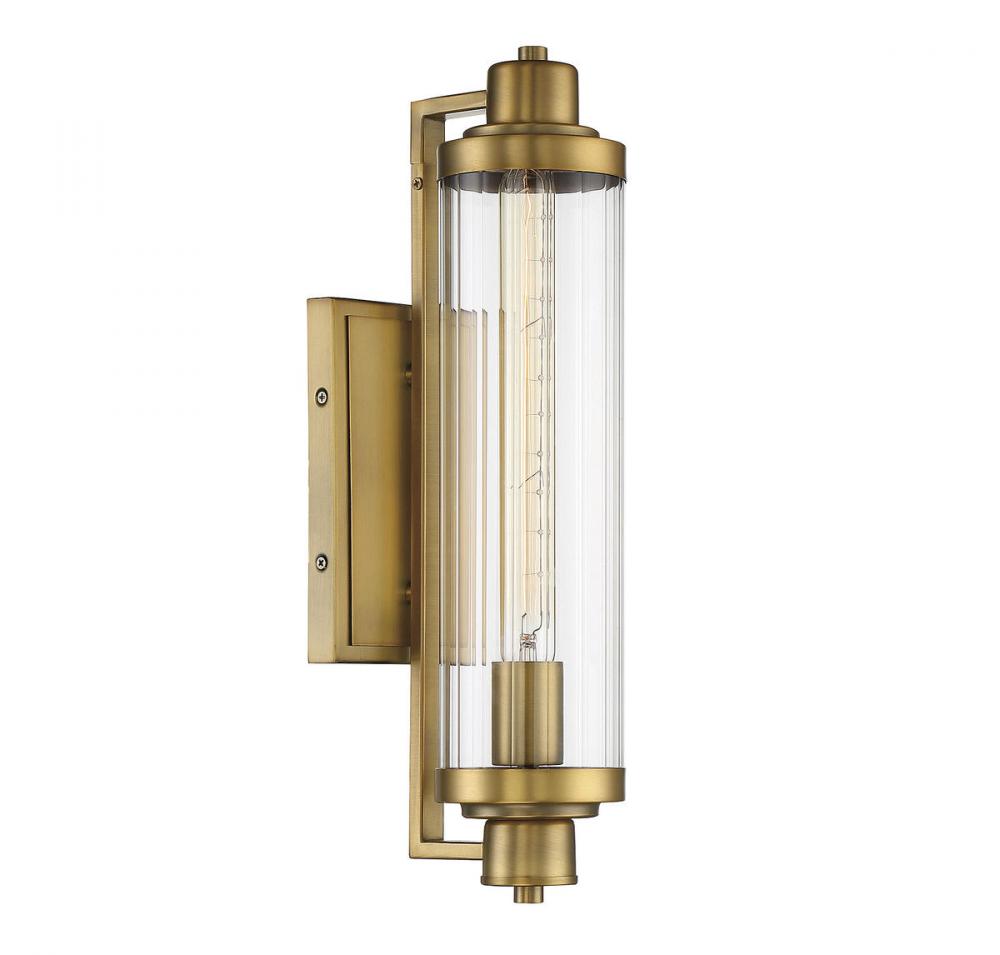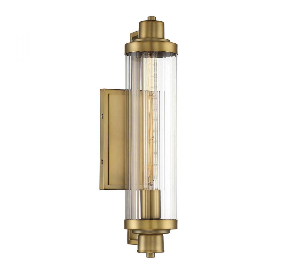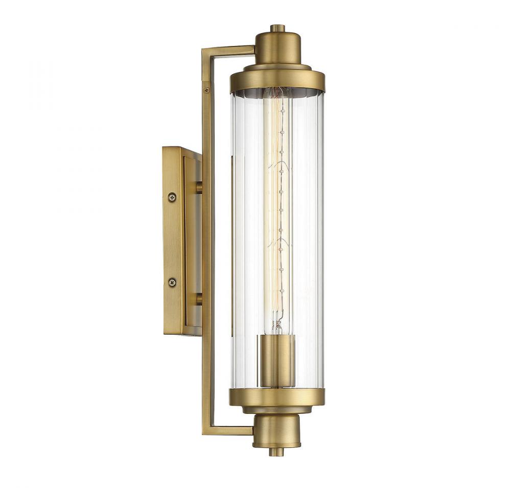 A tall, slim cylindrical shade of clear ribbed glass is supported by minimal hardware and a rectangular backplate in this Savoy House Pike 1-light sconce. It's a cool vintage look with a warm brass finish! Sconces add a touch of style and light to any wall, including but certainly not limited to hallways, entryways, stairways, great rooms and dining rooms. You will also often see a pair of sconces flanking a bathroom vanity mirror to provide an even, flattering wash of light. Bulb is included. The warm brass finish can be paired with brass hardware or mixed with hardware in other fixtures. Pike is perfect for contemporary and eclectic style spaces with a little edge. When you choose a Savoy House lighting fixture, you can be certain you’ve selected a piece that will withstand the test of time.