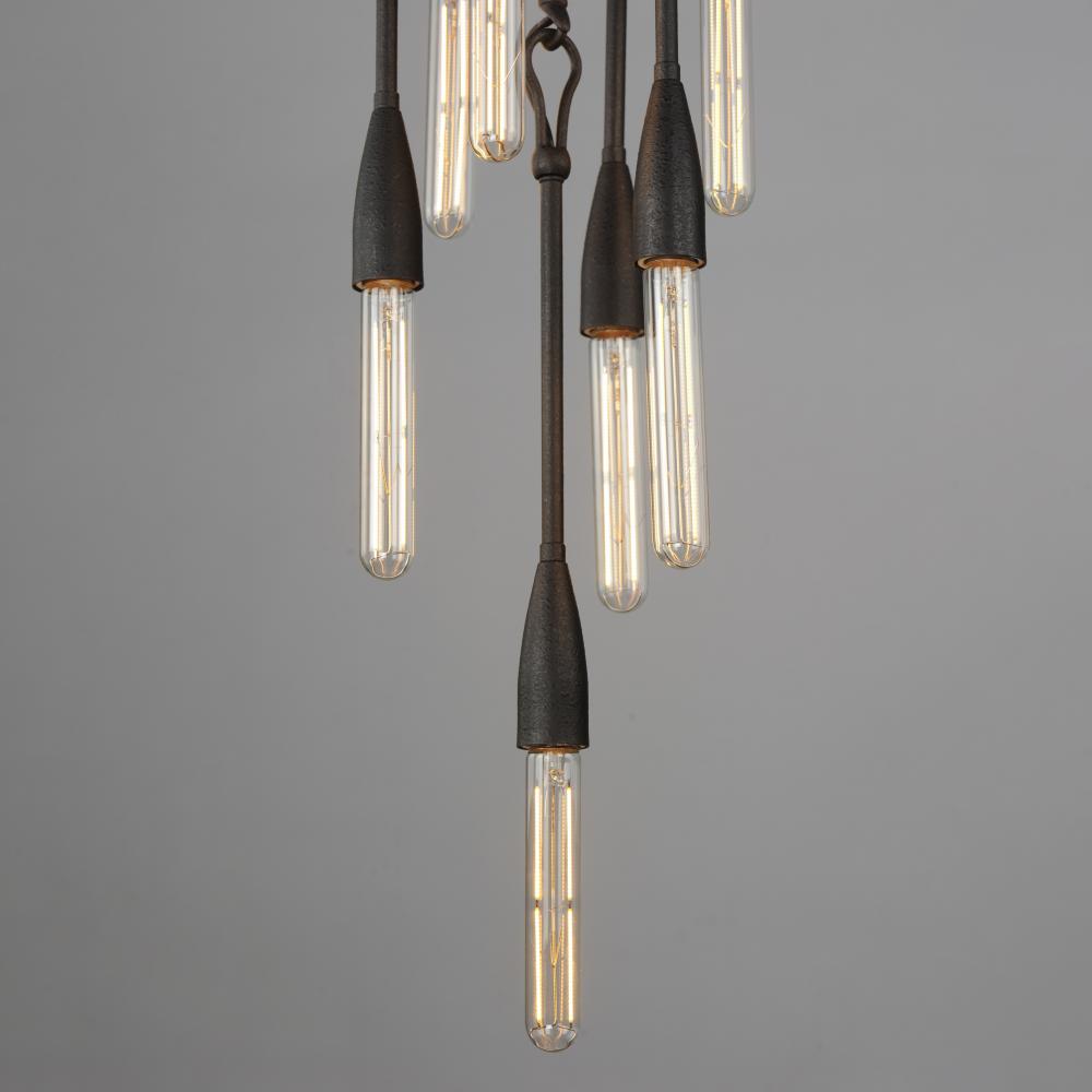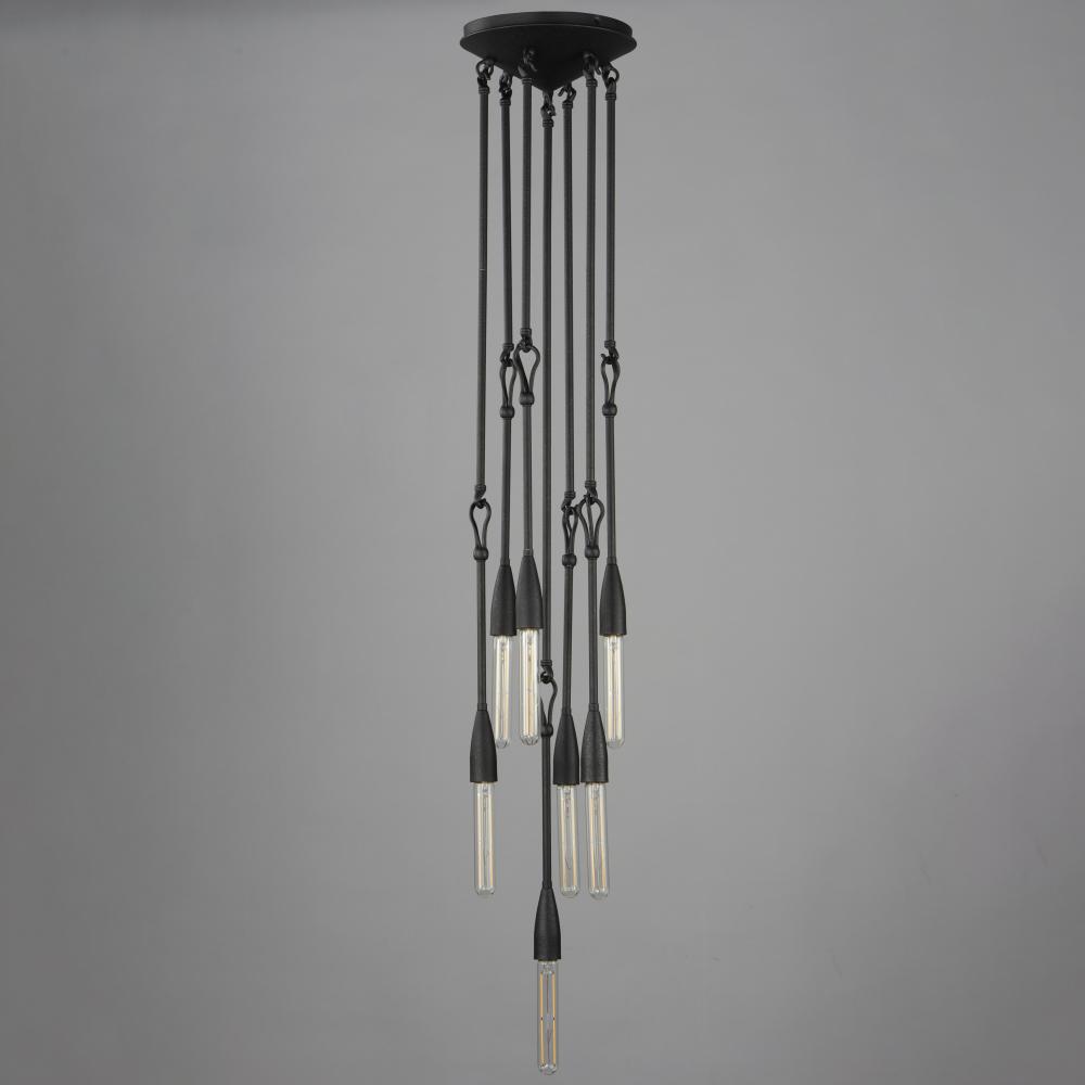 Simple with rustic elements, elongated rods are tiered with a forged iron hook and loop detail in multiple configurations. The fixtures' textured Anthracite finish enhances the artistry of the forged iron construction. Available in multi-pendant config