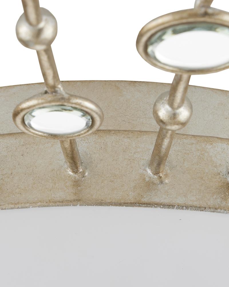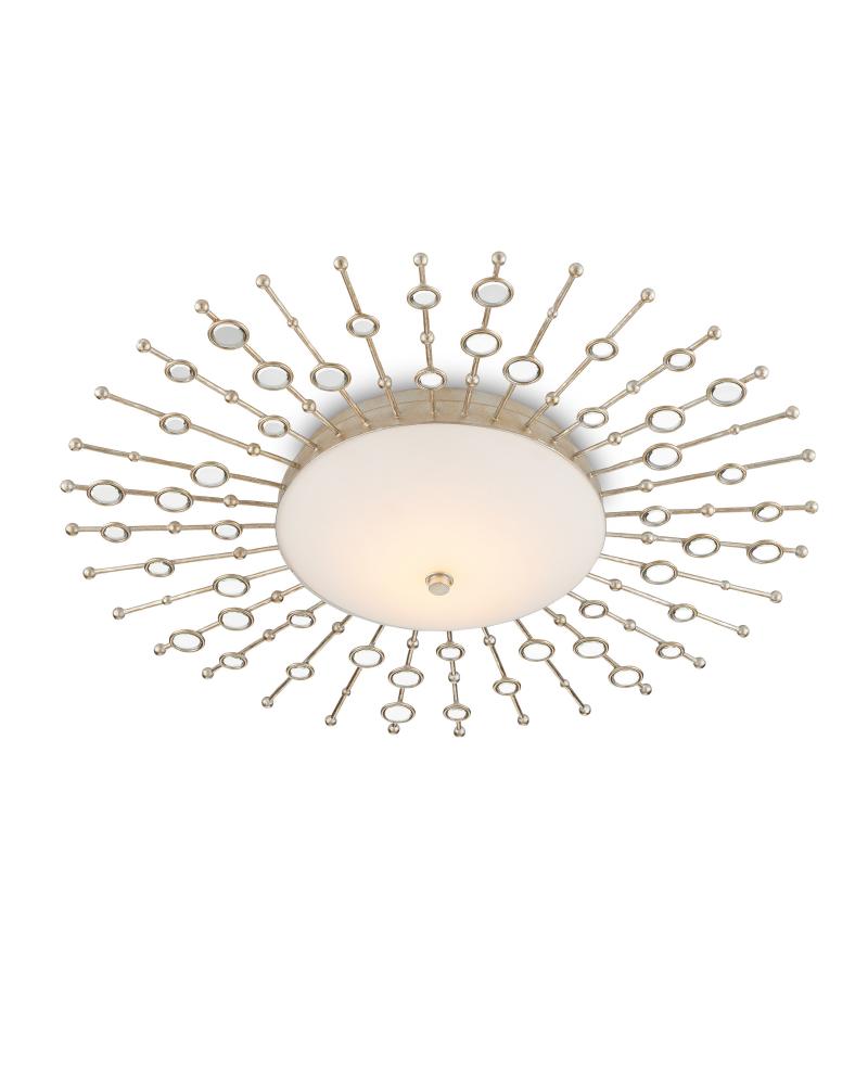 The heavenly profile of the Planisphere Flush Mount, which has a very low profile at a mere four inches from the ceiling, takes inspiration from mid-century modern wall decor while incorporating a contemporary feel into the classic style. The beveled circlets, made of frosted glass, fit seamlessly into the spokes in a silver leaf finish. This silver ceiling light glows with integrated LED technology.