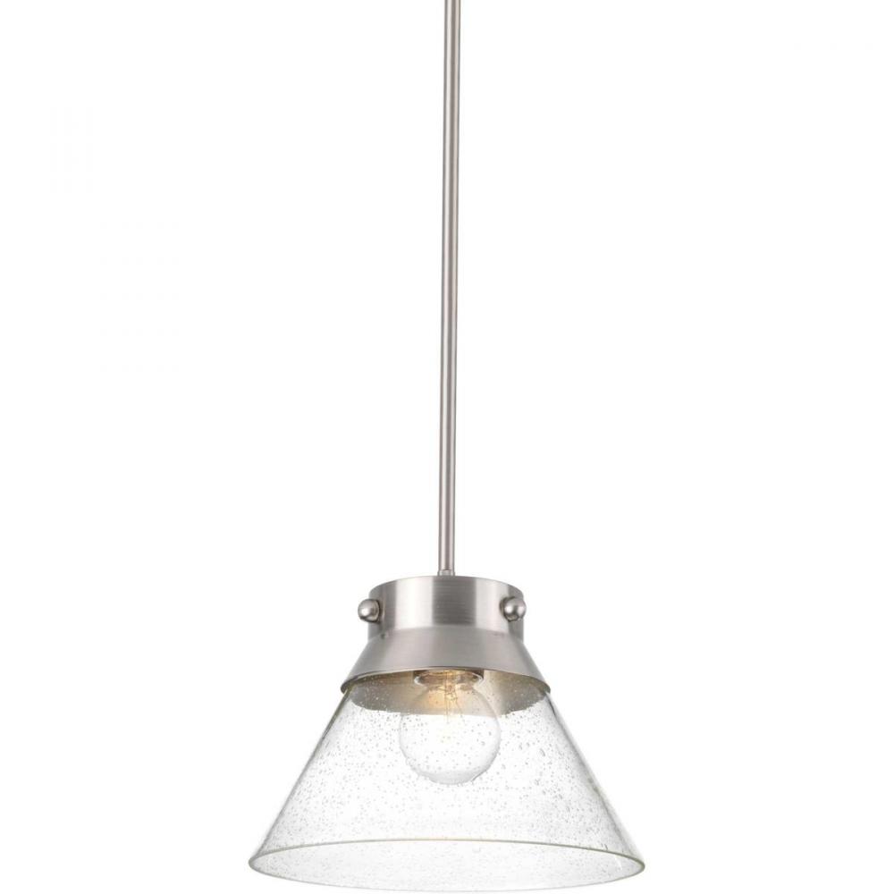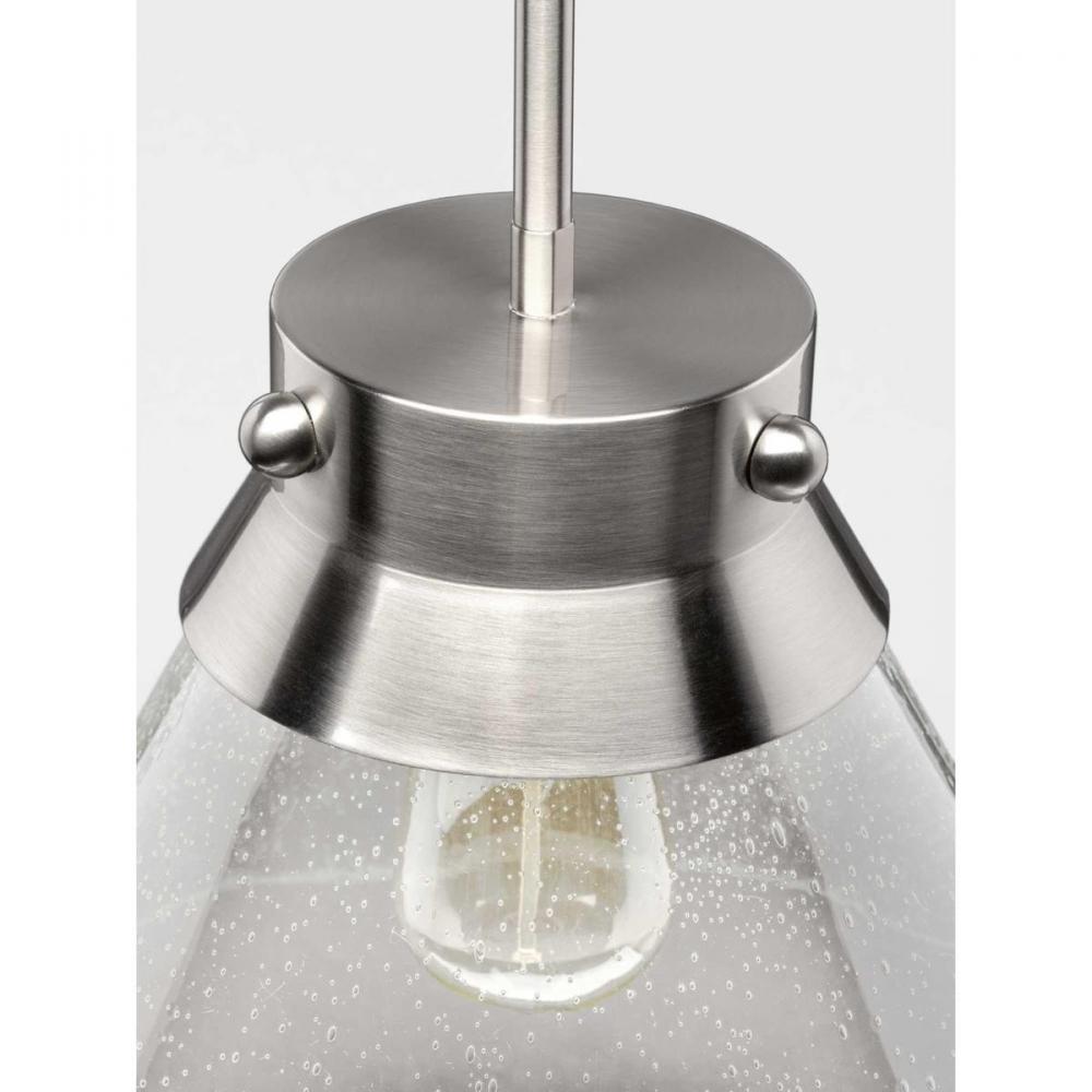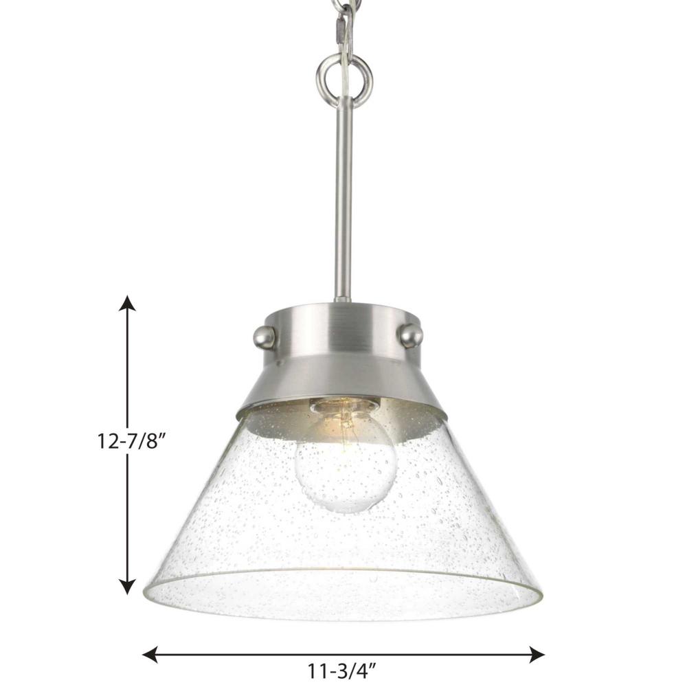 With an interesting mix of Farmhouse design and industrial, almost nautical details, the Tapia Trail pendant is Americana style at its best. A banded metal collar accented with rivets in Brushed Nickel call out to its Coastal nautical origins and is attached via a hook for an added industrial style. A flared, seeded glass shade finishes the look with a charming Farmhouse touch. This family of fixtures is part of the Jeffrey Alan Marks Point Dume™ lighting collection which celebrates a curated mix of yesterday and today, distilling both industrial and artisanal influences.