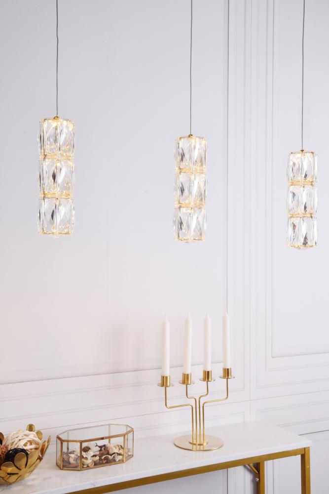 The Polaris collection is the epitome of "cool" in lighting, because each of the fixtures has rectangular, Royal-cut crystals that look like ice cubes, gracefully suspended from a stainless-steel base with a bright gold finish. Designed for rooms with higher ceilings, these fixtures are definitely stylistic attention-getters.