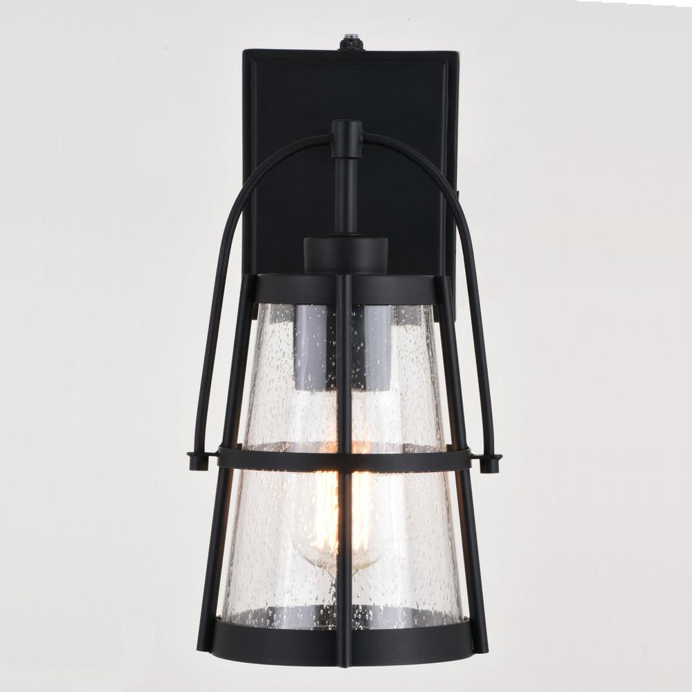 Eclectic styling gives this collection called Portage Park its inviting aesthetic. Open squares of matte black framing define the shape as it hangs from a slim arch. Tapered seeded glass follows the line of its outer companion. Light the way to the outdoor porch, entryway, garage, or any other area of your home.