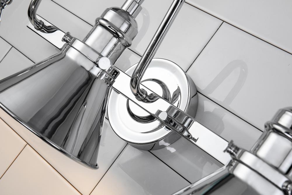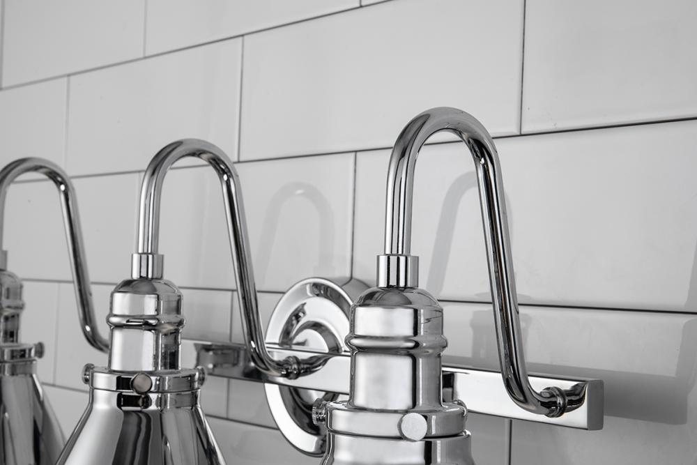 A 3-light polished chrome vanity with a high arched arm and cone shades. Its modern farmhouse design suits damp spaces, ideal over mirrors with vintage style.