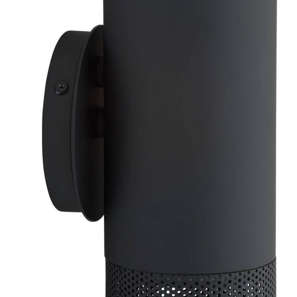 The Punch small outdoor sconce is a subtle, linear option for exterior spaces. A perfect pairing of solid and perforated marine grade matte black steel cylinders on a rounded mounting plate, Punch casts a diffuse downward glow. A protective coating helps withstand the elements.