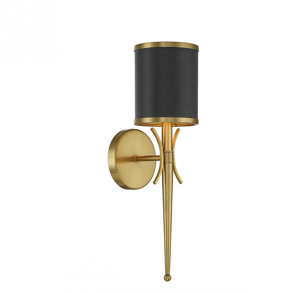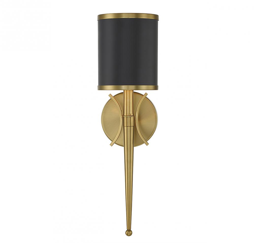 The Savoy House Quincy 1-light sconce showcases bold, stately style with its classic shape, thoughtful detailing and warm brass finish. The matte black metal shade will create indirect yet dramatic lighting. Quincy is 18.5" in height, 5.25" in width and extends 7" from the wall. It uses 1 candelabra size bulb with a max of 60 watts (bulb not included).