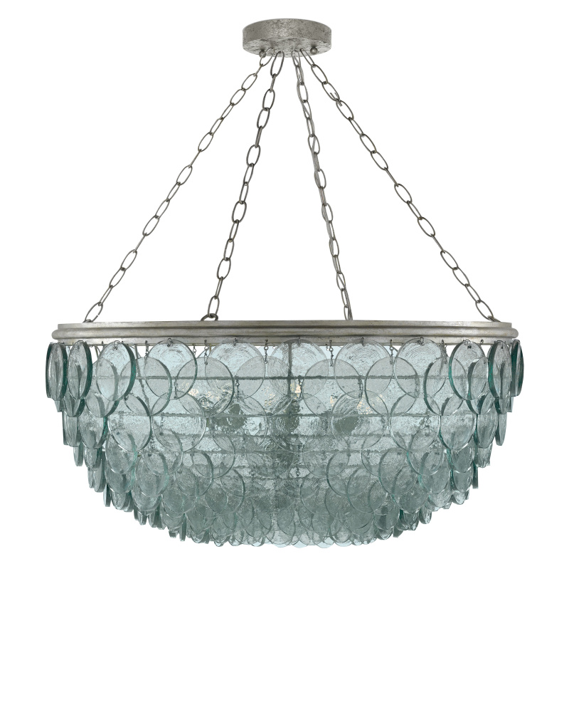 Recycled glass discs dangle from the wrought iron frame of this small version of the Quorum Chandelier to form a textural shade that turns the light emanating through it into a mottled mosaic. The discs overlap to form this ecofriendly artistic statement. The metal of the eight-light fixture has been treated to a silver leaf finish that adds to its gleaming artistry.